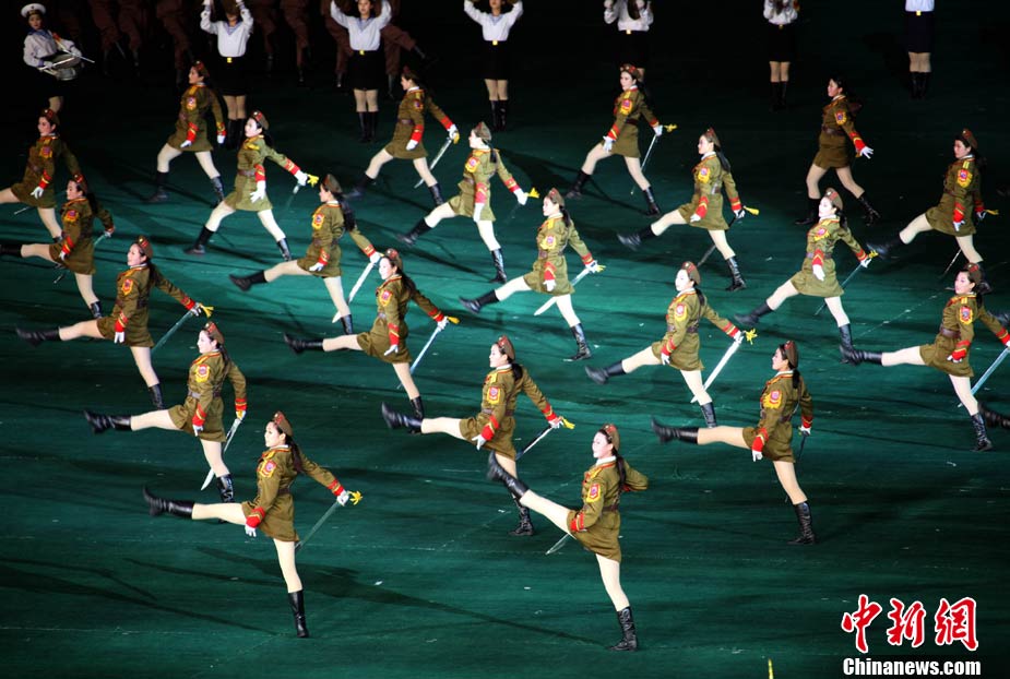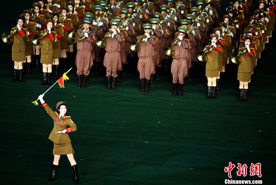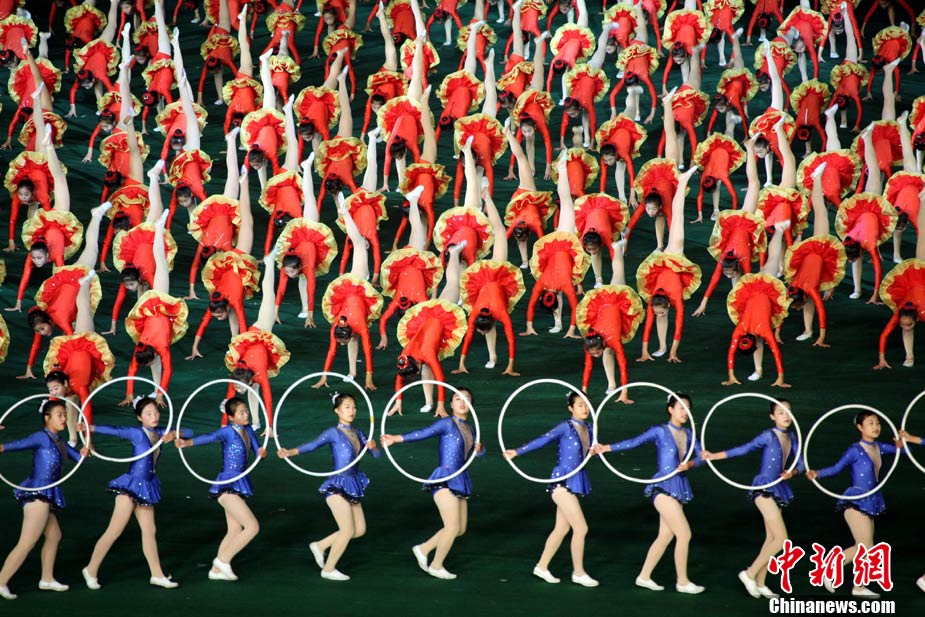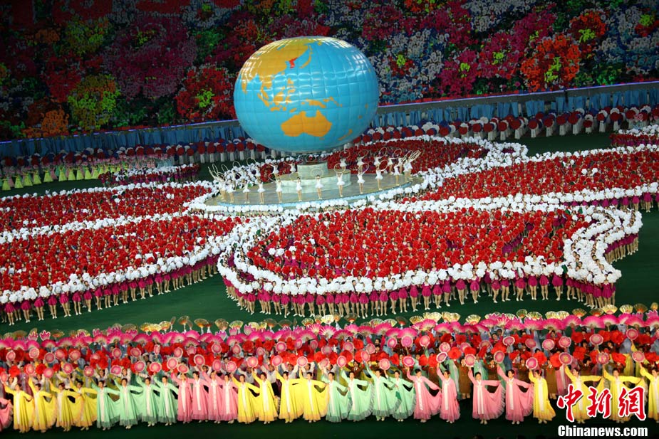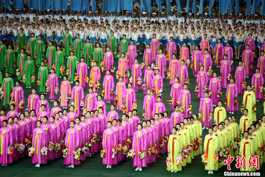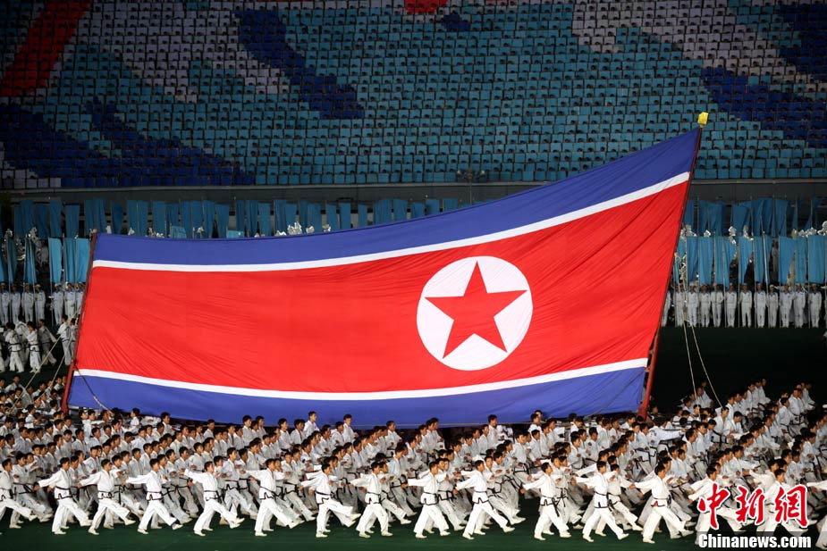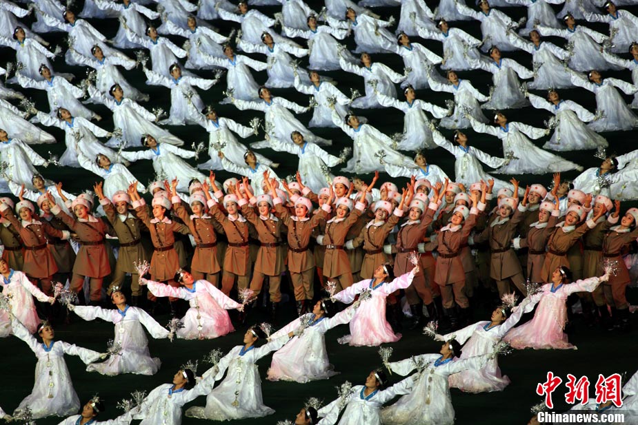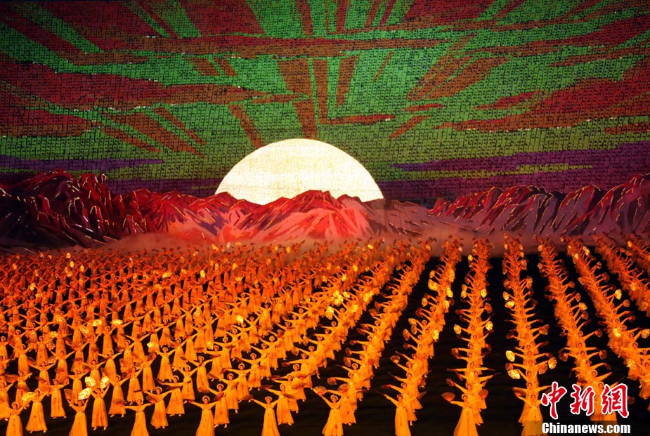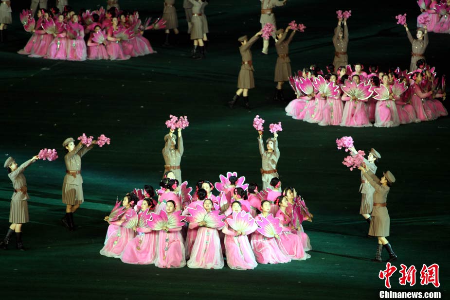 10月23日,朝鮮在平壤“五一”體育場為紀念中國人民志愿軍入朝參戰60周年舉辦大型團體操和藝術表演《阿里郎》。 中新社記者 孫自法 攝