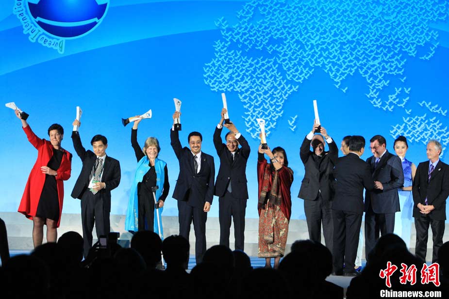10月30日晚,上海世博會舉行頒獎晚會,頒發“世博會獎”、“COSMOS”獎、“國展局獎章”!笆啦⿻劇狈譃锳BCD四類展館和金銀銅等次以及展館設計獎、創意展示獎、主題演繹獎。圖為英國、韓國、西班牙分別獲得A類展館設計獎金銀銅;沙特、日本、馬來西亞分別獲得創意展示獎金銀銅;德國、俄羅斯、法國分別獲得主題演繹獎金銀銅。 中新社記者 潘索菲 攝