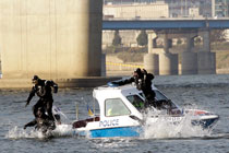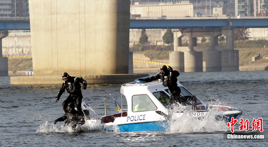 當地時間11月3日,韓國首爾附近的漢江中韓國水警舉行了針對G20峰會安保工作的演練。