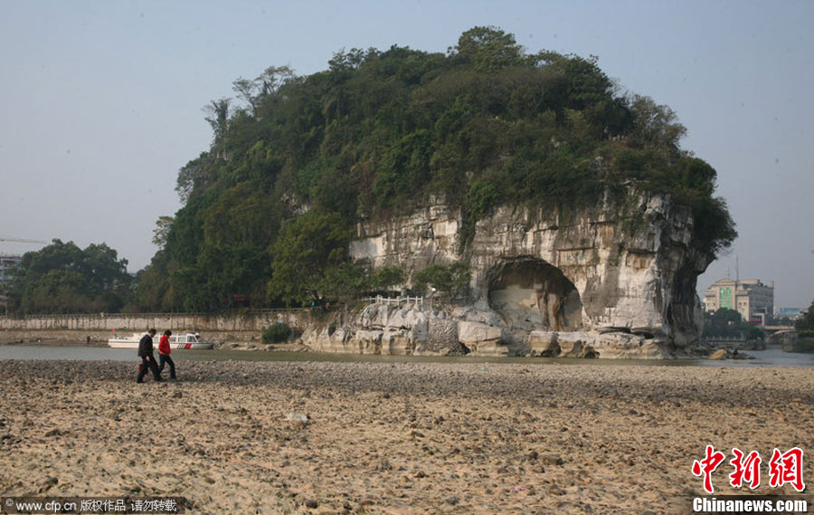 2010年11月4日,廣西桂林,象鼻山前干涸的河床。入秋以來,桂林持續(xù)干旱,漓江水位下降,進(jìn)入秋冬枯水期。李凱 攝 圖片來源:CFP視覺中國