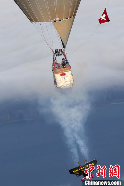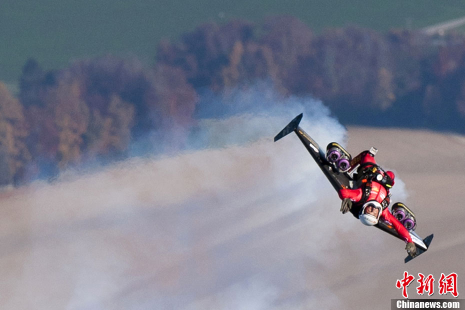 當地時間2010年11月5日,瑞士貝爾謝“火箭人”伊夫-羅西使用裝有小型噴氣發動機的噴氣動力翼,首次完成空中翻轉特技。