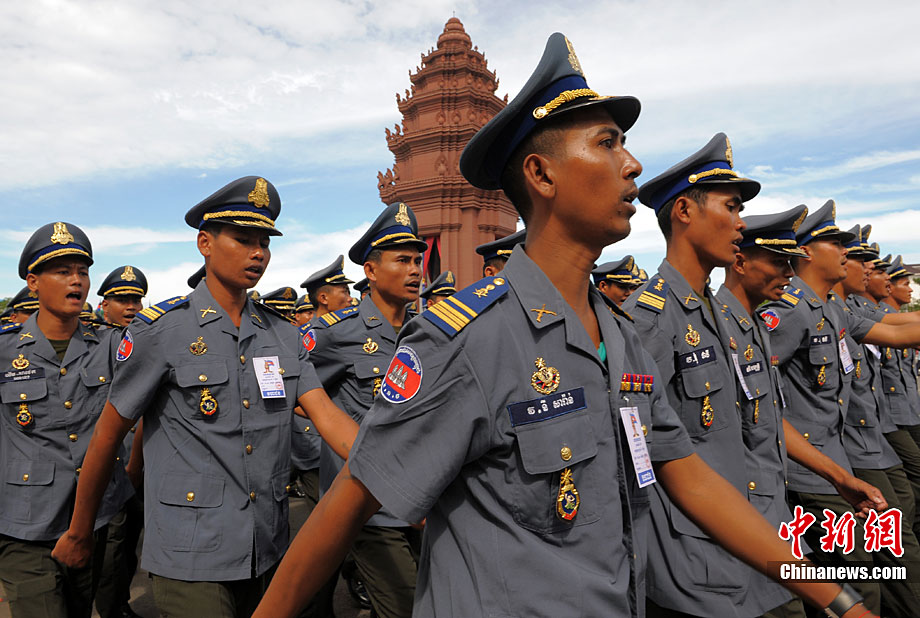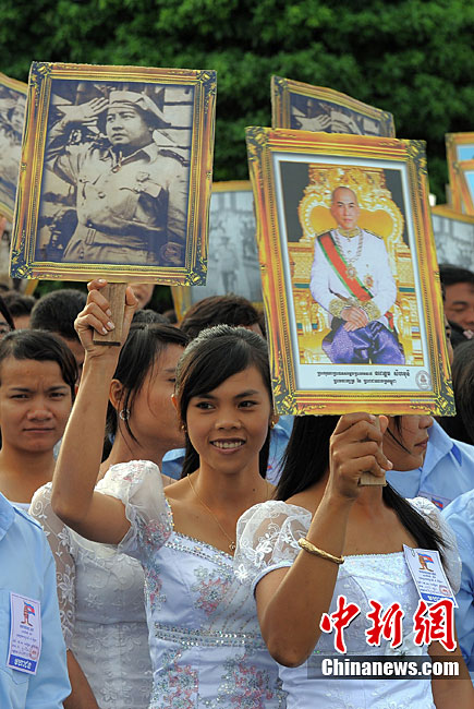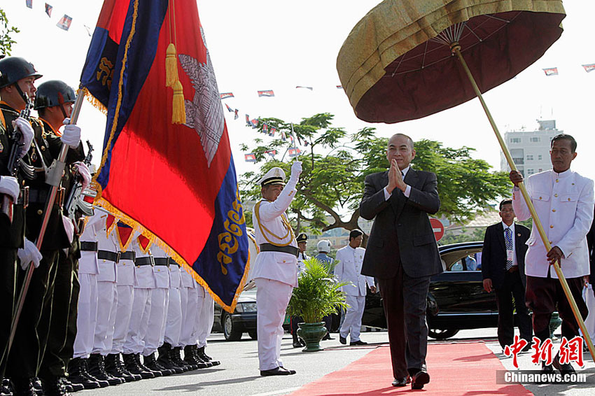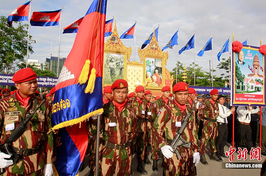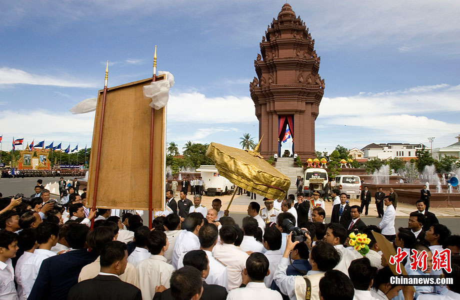 11月9日,工作人員在獨立節(jié)慶祝儀式上放飛彩球。當天,柬埔寨在金邊獨立紀念碑廣場舉行盛大儀式,熱烈慶祝國家獨立57周年。柬埔寨國王西哈莫尼、國會主席韓桑林、政府首相洪森等政要以及各國駐柬使節(jié)和各界代表約2萬人出席儀式。