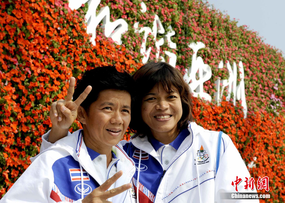 11月11日,泰國代表團舉行廣州亞運會亞運村升旗儀式。圖為泰國運動員在現場合影留念。中新社記者 王東明 攝