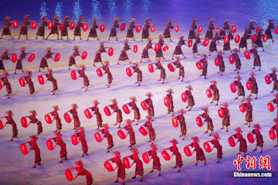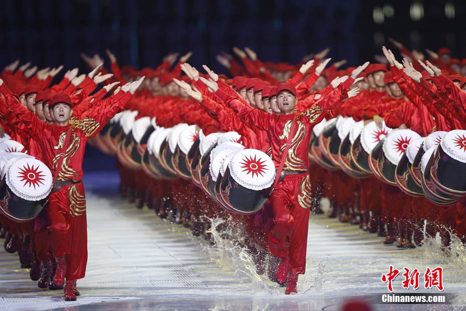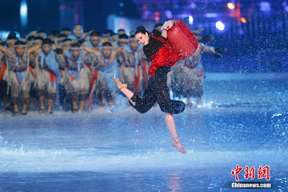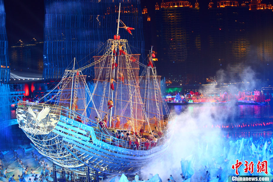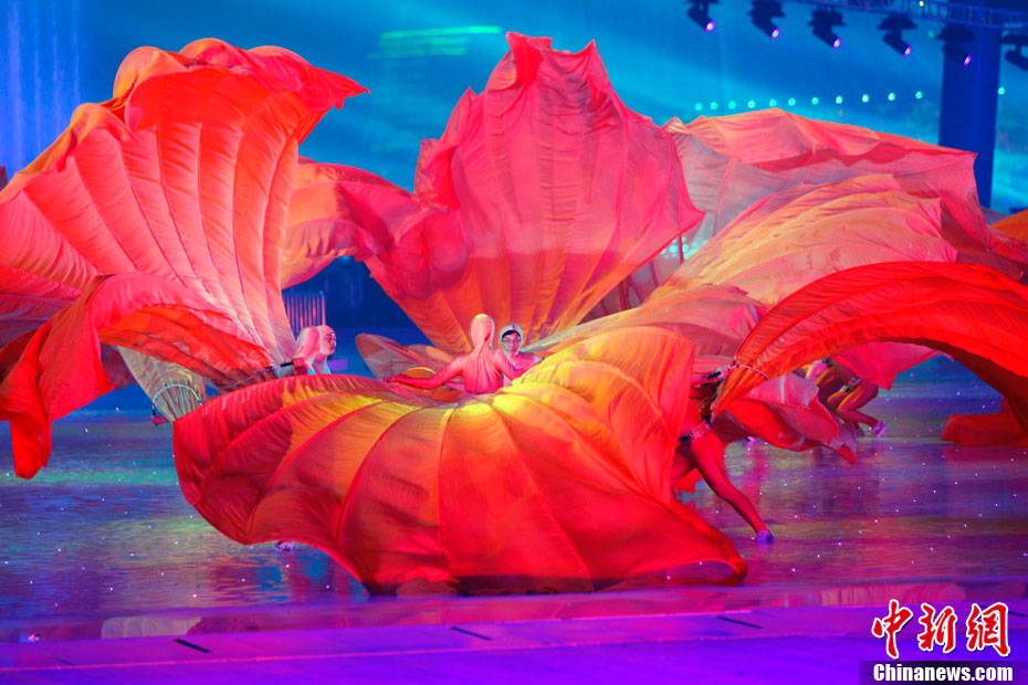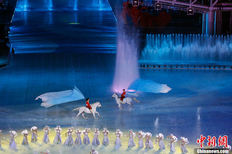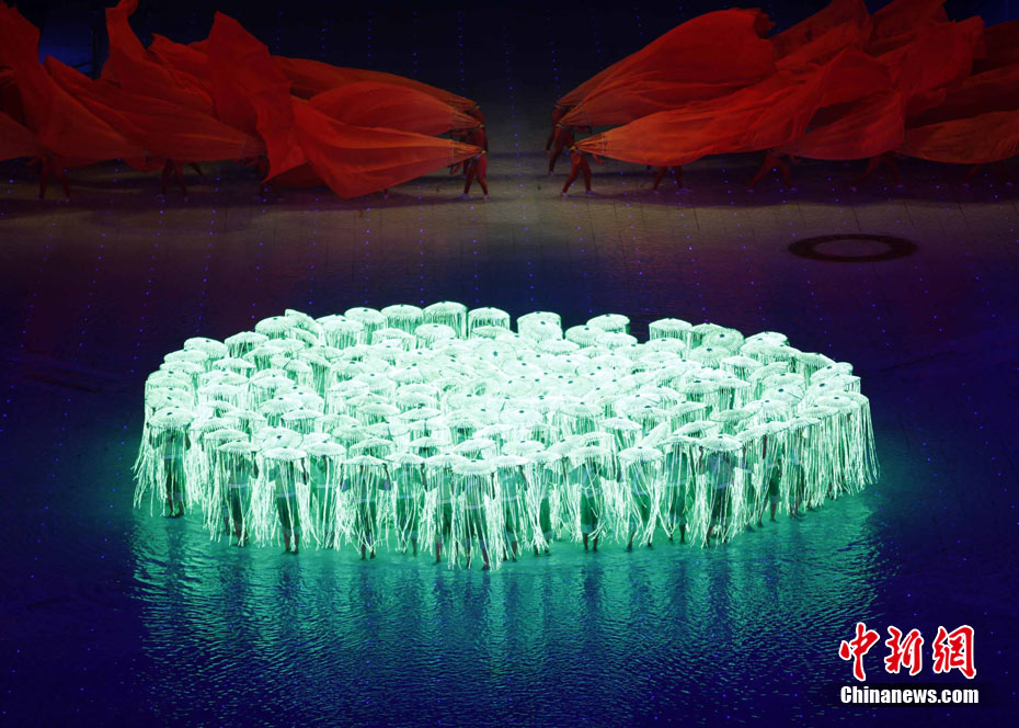 11月12日晚,第16屆亞運會開幕式在廣州海心沙舉行,宏大、絢麗的文藝匯演《啟航》給亞洲以及世界觀眾帶來藝術盛宴。水是廣州亞運開幕式最主要的創意元素,幕式的表演從一滴水到汪洋大海,從一葉扁舟到巨型帆船,從一汪情水到滔天巨浪。演員們用各種表演手段盡情展現水的魅力,表達水是生命之源、滋養萬物、呵護人類文明的精神內涵,令人嘆為觀止。中新社記者 杜洋 攝