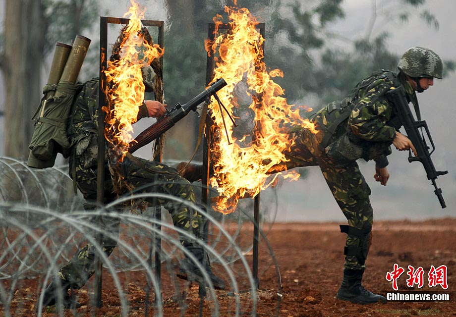 11月13日,“友誼行動-2010”中國與羅馬尼亞陸軍山地部隊在云南昆明進行了9天的聯合訓練后結束。中羅雙方士兵在結訓儀式上進行了步槍、狙擊槍射擊的匯報表演和混合編隊克服山地障礙等戰術綜合演練。圖為中羅雙方士兵表演戰術綜合演練穿過火圈。中新社發 任東 攝