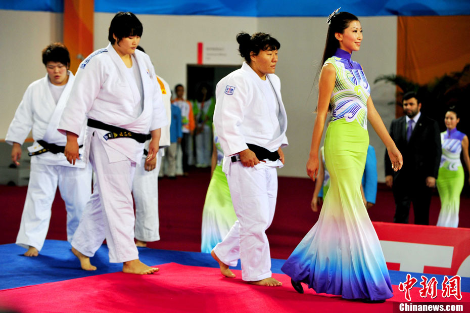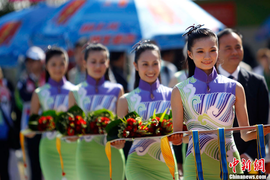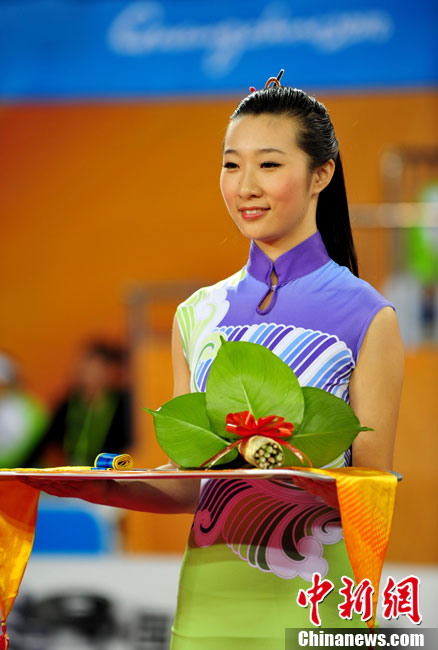 11月13日,2010年廣州亞運(yùn)會(huì)展開(kāi)了首日的爭(zhēng)奪,漂亮的禮儀小姐紛紛亮相。中新社記者 趙振清 攝