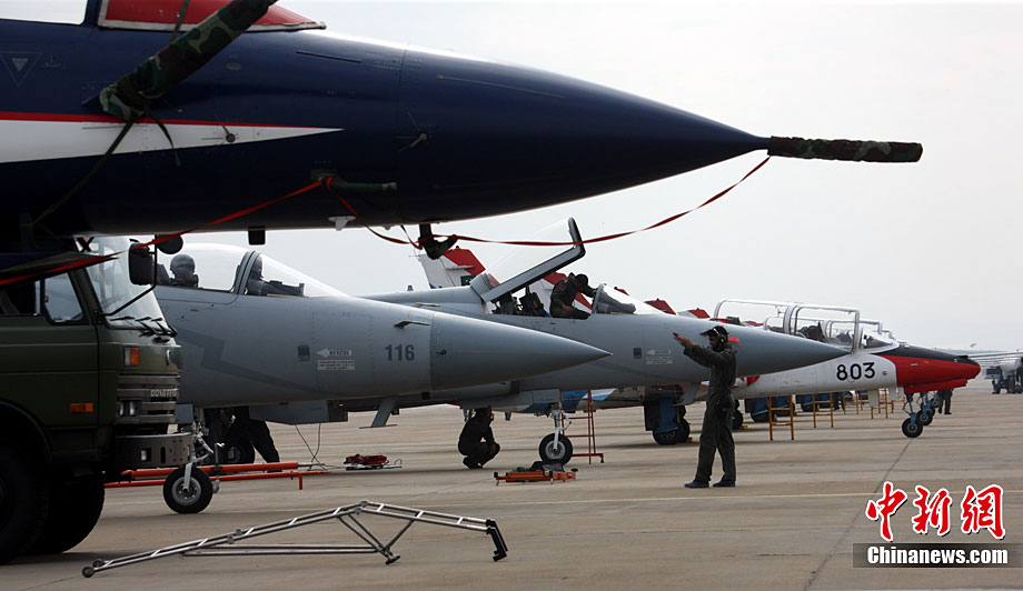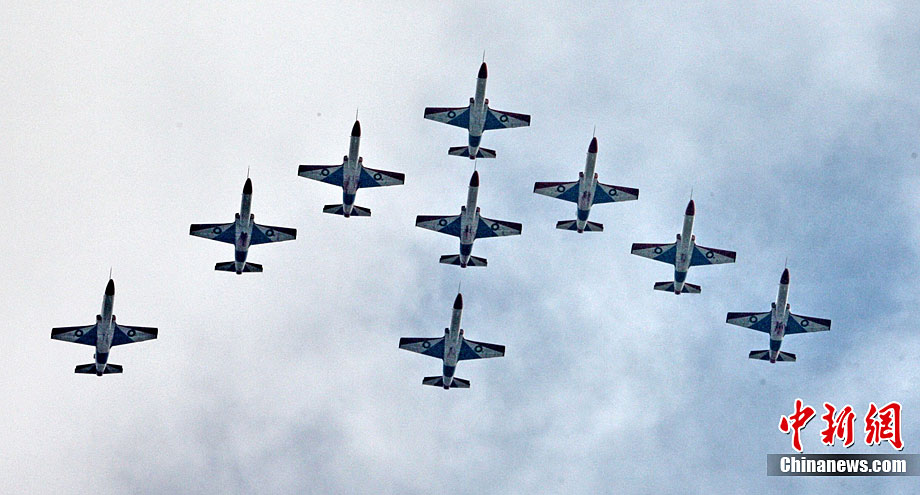 11月13日下午,巴基斯坦空軍“雄獅”飛行表演隊的飛行員駕駛k8教練機進行九機密集隊形飛行訓練。昨日,巴基斯坦空軍“雄獅”飛行表演隊抵達珠海,這支表演隊由10架K8教練機和一架C130運輸保障機組成。由外國飛行員駕駛“中國造”飛機在中國航展上表演,必將是一道優美而又特別的風景。圖為巴基斯坦空軍“雄獅”飛行表演隊的飛行員駕駛k8教練機進行九機密集隊形飛行訓練。圖片來源:CNSPHOTO 喬天富 攝