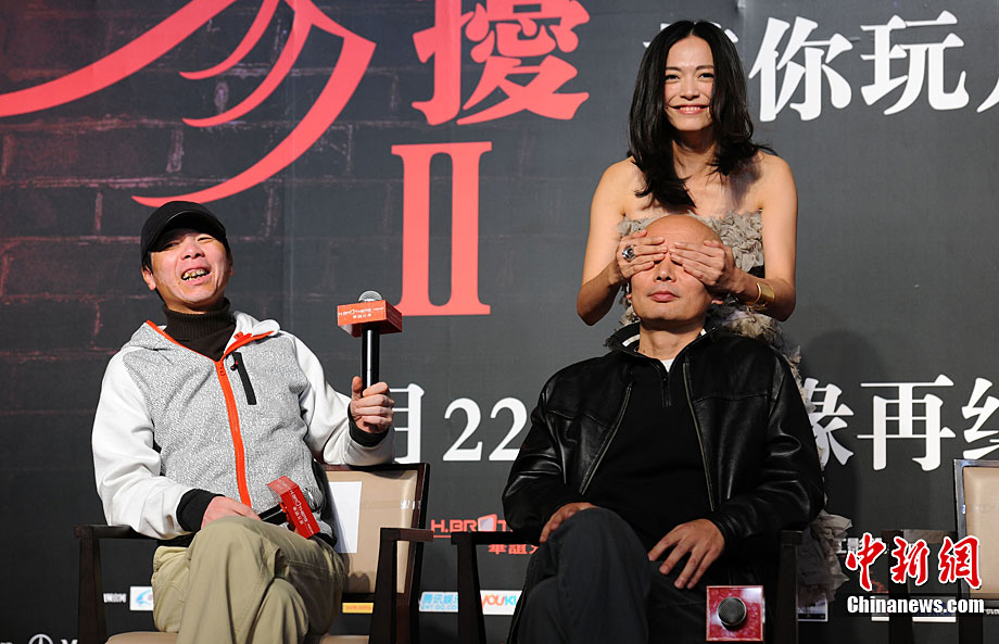 11月14日,將于12月22日賀歲上映的《非誠(chéng)勿擾2》在北京舉行發(fā)布會(huì),發(fā)布電影的美景花絮,并隆重介紹本次影片與北京市旅游局的合作。發(fā)布會(huì)上,除主演葛優(yōu)外,姚晨、安以軒、廖凡、邵兵并未參演前作《非誠(chéng)勿擾》的拍攝,這也是續(xù)集新成員的第一次集體亮相。發(fā)布會(huì)上馮小剛導(dǎo)演證實(shí),“《非誠(chéng)勿擾2》海報(bào)上蒙葛優(yōu)眼睛的手是姚晨的。”現(xiàn)場(chǎng)媒體要求姚晨與葛優(yōu)情景重現(xiàn),盡管姚晨笑說(shuō),她跟舒淇是好姐妹,不能在人不在的時(shí)候占秦奮便宜。但還是難以抵擋眾人要求盛情難卻,現(xiàn)場(chǎng)蒙住了葛優(yōu)雙眼并送上香吻,葛優(yōu)事后享受地說(shuō)“不錯(cuò)”。中新社記者 李學(xué)仕 攝