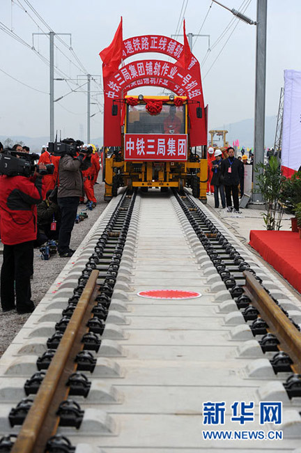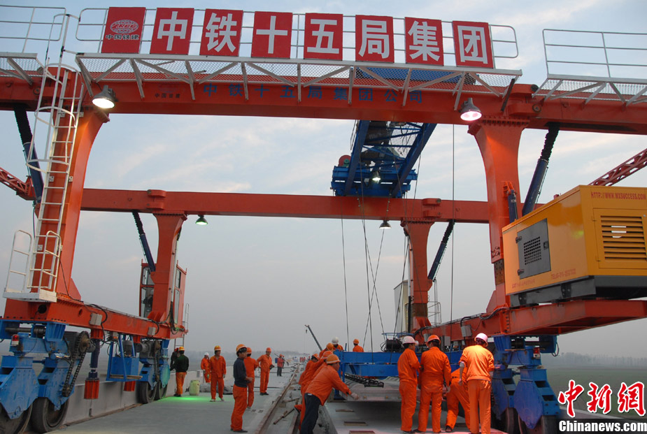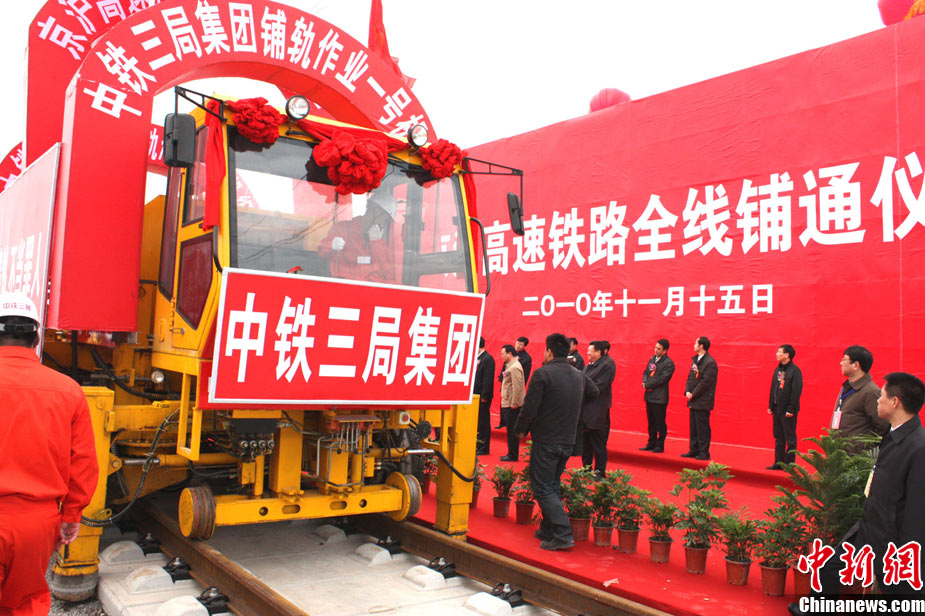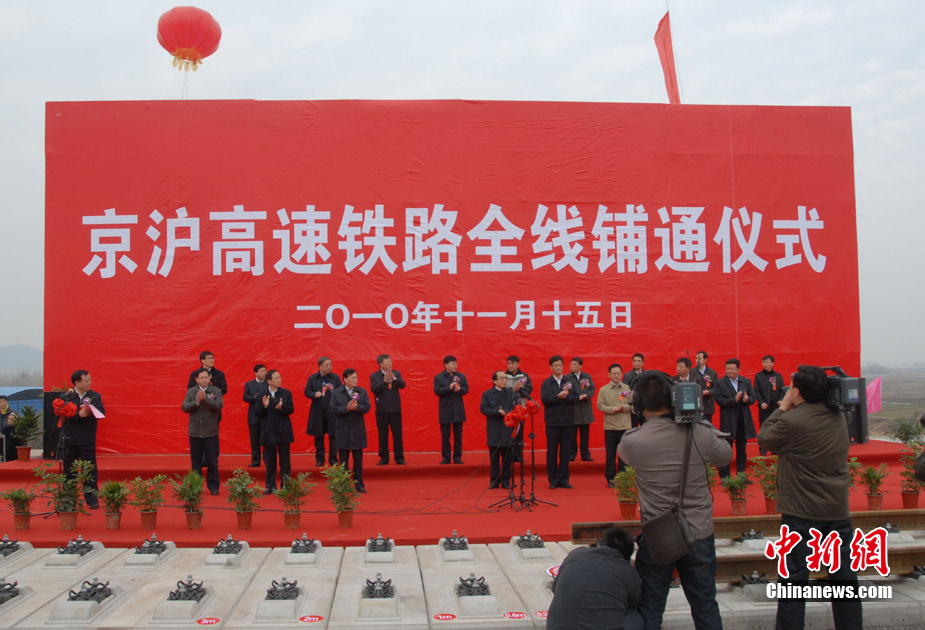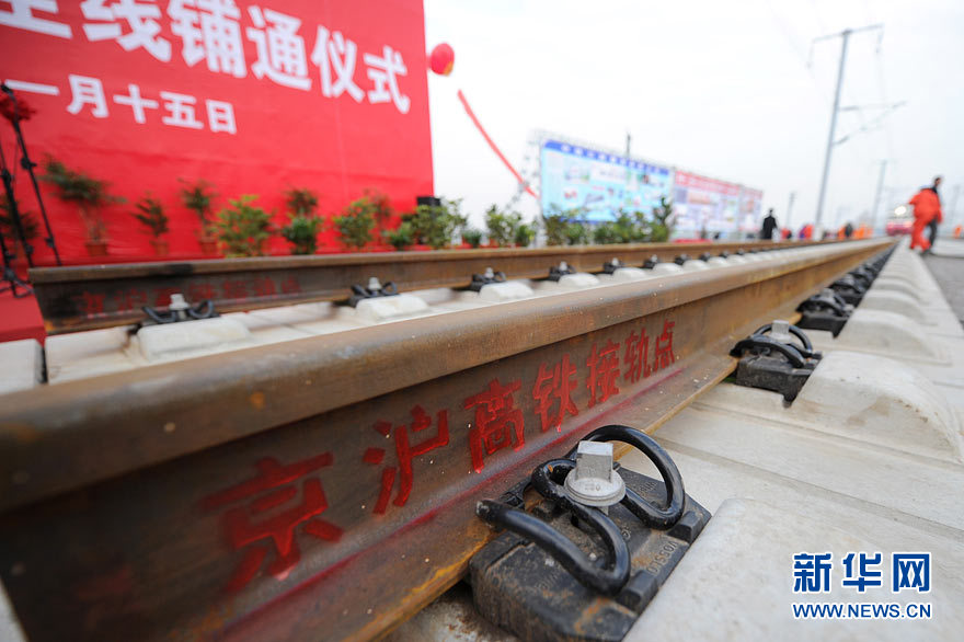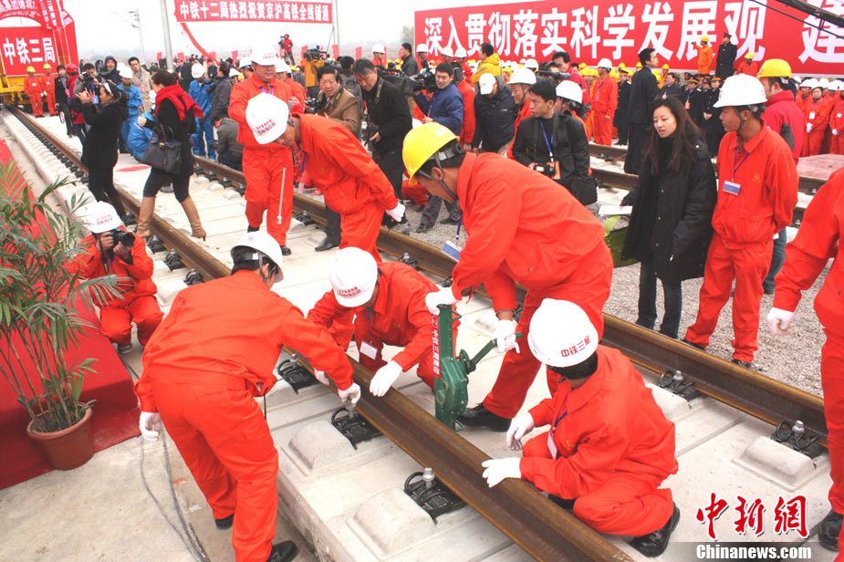 11月15日上午,隨著最后一根鐵軌在安徽蚌埠段順利鋪下,京滬高速鐵路全線完成鋪通工程,這是京滬高速鐵路建設取得的又一重大階段性成果。京滬高速鐵路的全線鋪通,標志著以線下工程和鋪軌為主的站前工程全部結束,下一步將全力推進以牽引供電、通信、信號、電力“四電集成”施工和站房建設為主的站后工程施工,展開全線聯調聯試。圖為15日,京滬高鐵先導段鋪通儀式在京滬高鐵蚌埠南火車站舉行。中鐵十五局員工在接軌點安裝最后一組鋼軌鎖定螺栓。(張智海 范剛軍 李紅)