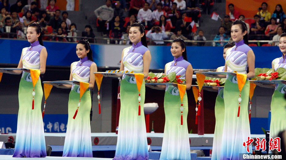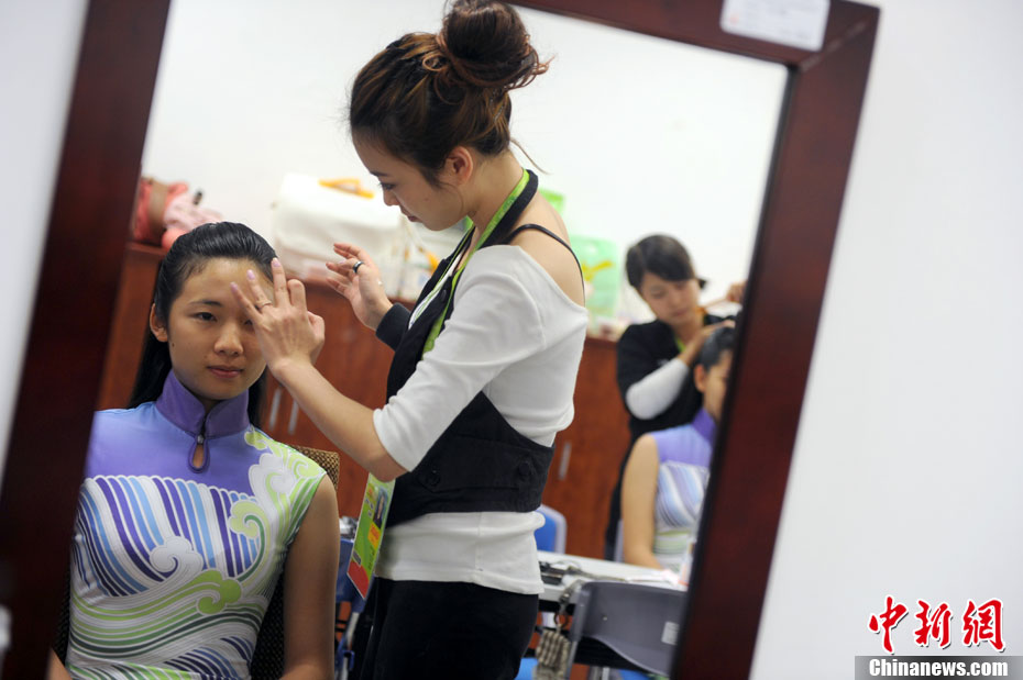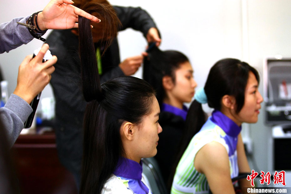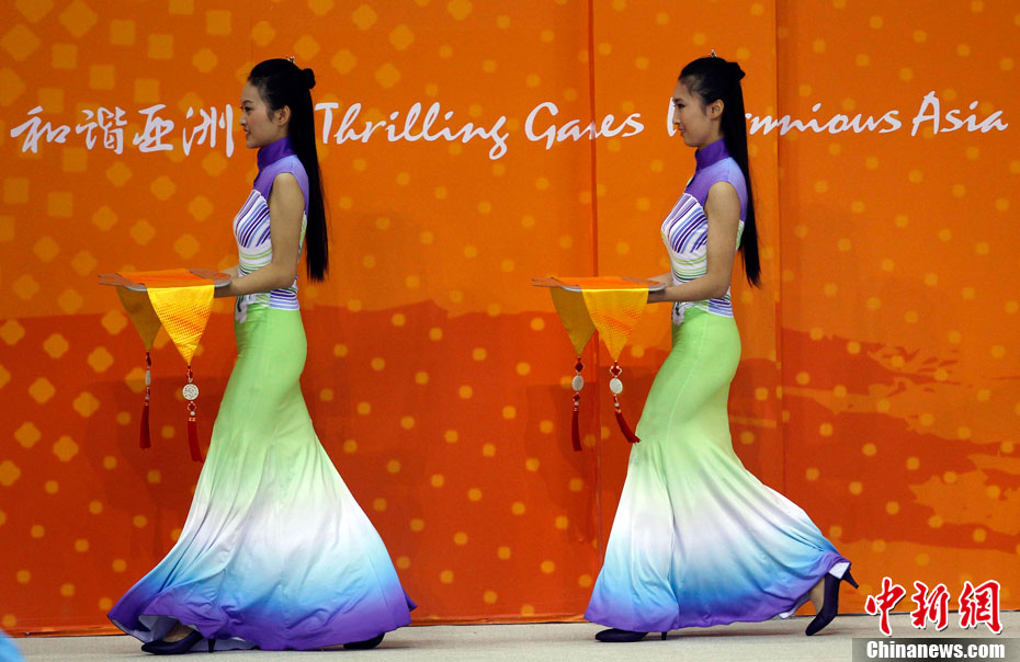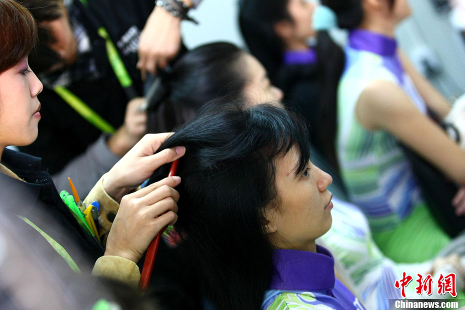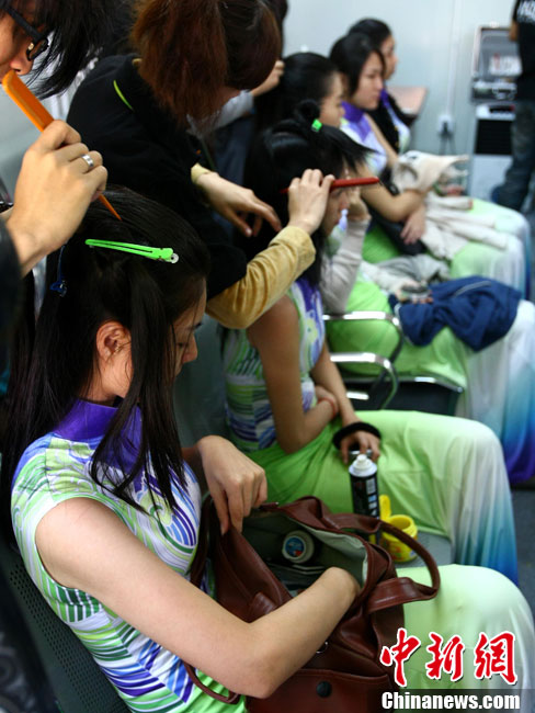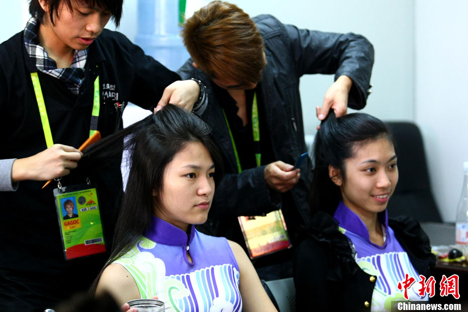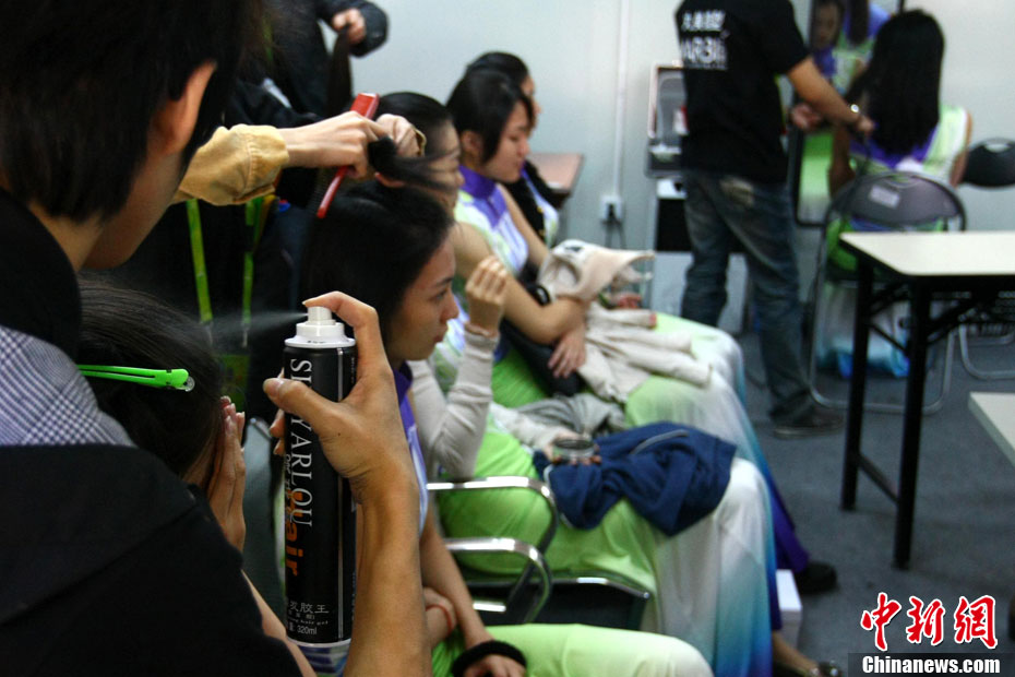 廣州亞運(yùn)會比賽開始后,對于這些美麗的姑娘們“戰(zhàn)斗”才剛剛打響,她們每天早上6點半就起床,趕到賽場,開始4個小時的準(zhǔn)備工作——化妝、做頭發(fā)、整體造型,這一切都為頒獎典禮的那短短一刻。