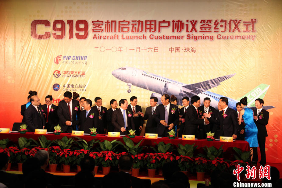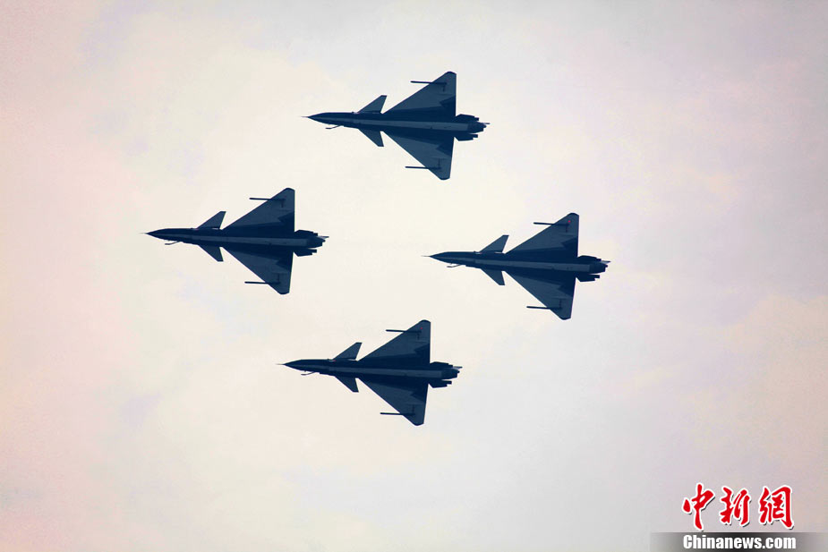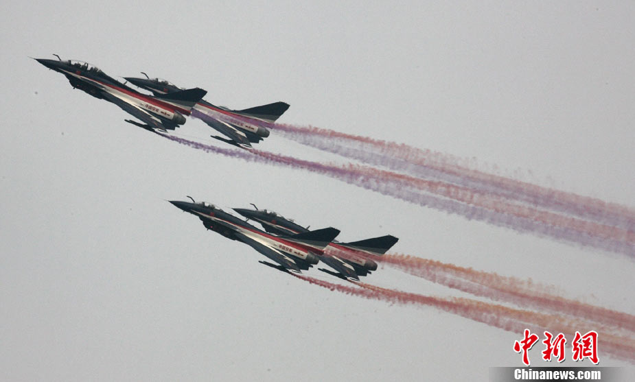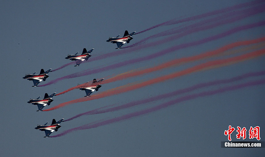 11月17日,在珠海第8屆中國國際航空航天博覽會上,中航公司組織中國獲獎十佳空中乘務員,向殲10飛機總設計師、剛做完飛行表演的空軍八一飛行表演隊的空中英豪們獻上鮮花。圖片來源:CNSPHOTO 喬天富 攝