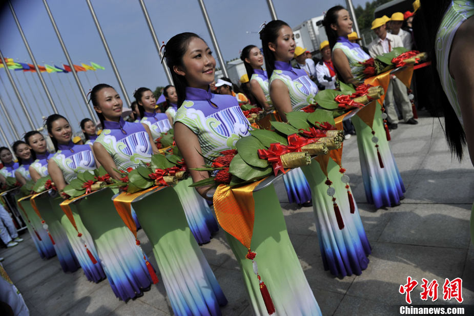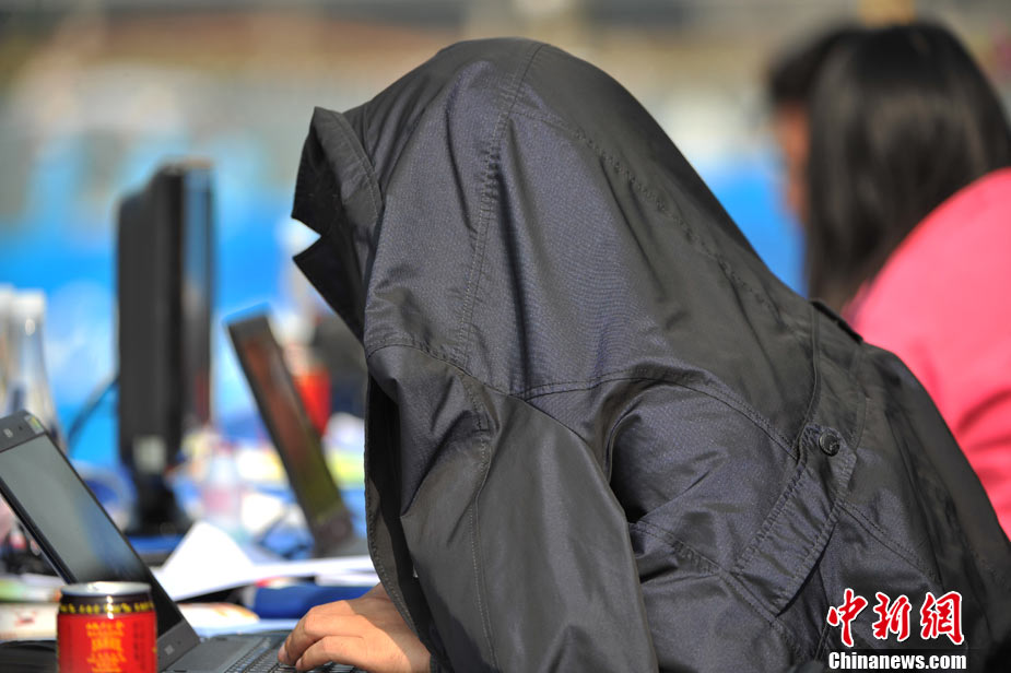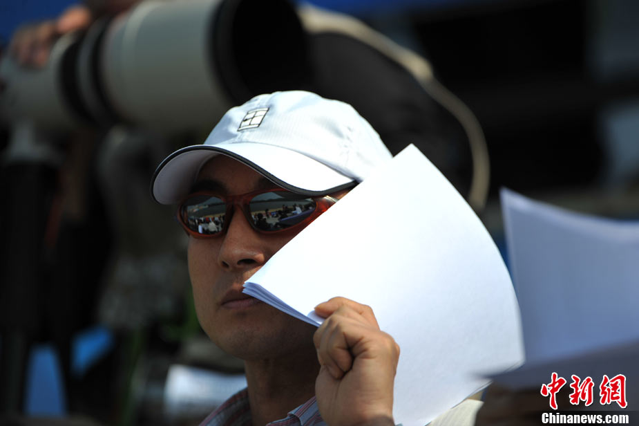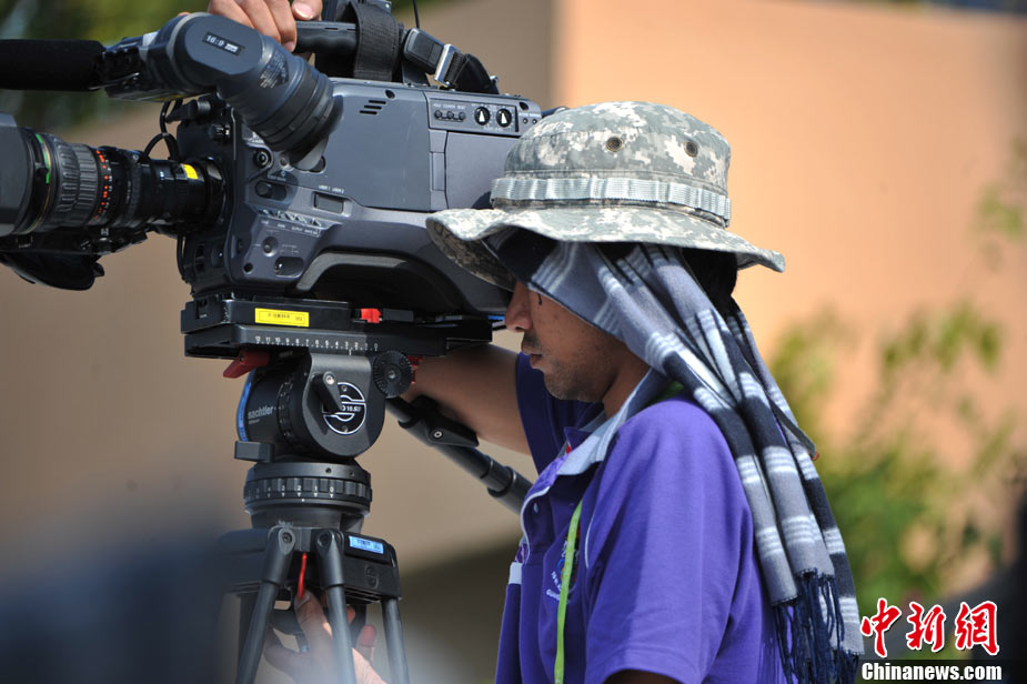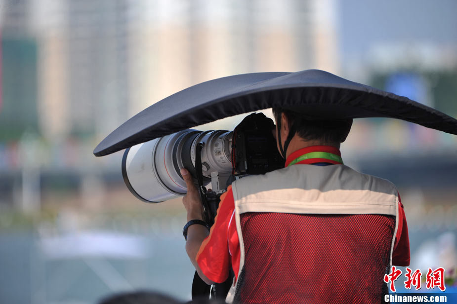 11月18日上午,亞運會龍舟項目在增城開賽,戶外工作的攝影記者頭戴巨型帽子遮陽,以便更好的工作。中新社記者 金碩 攝