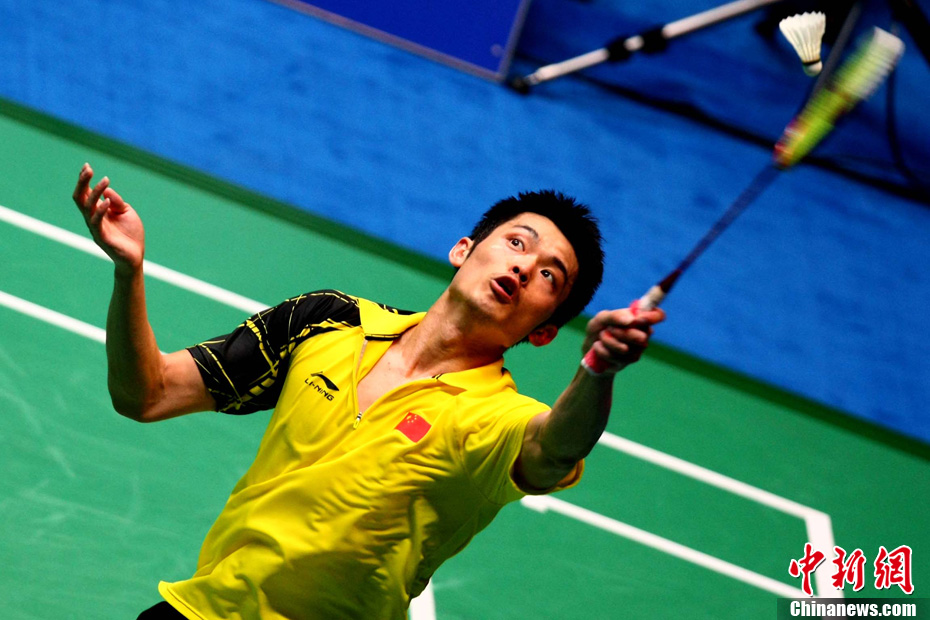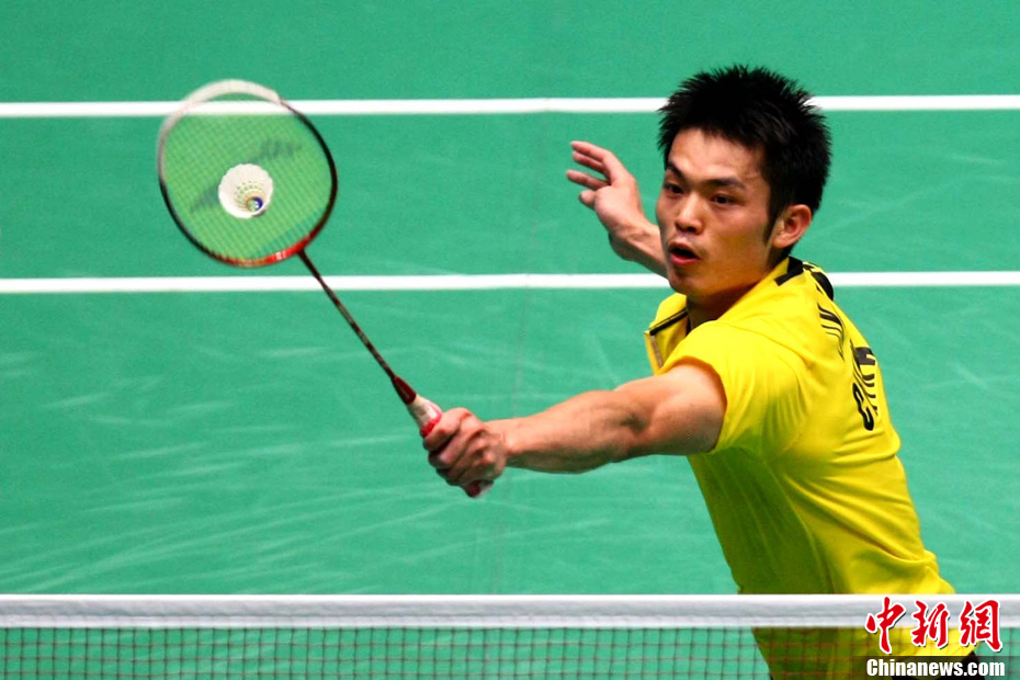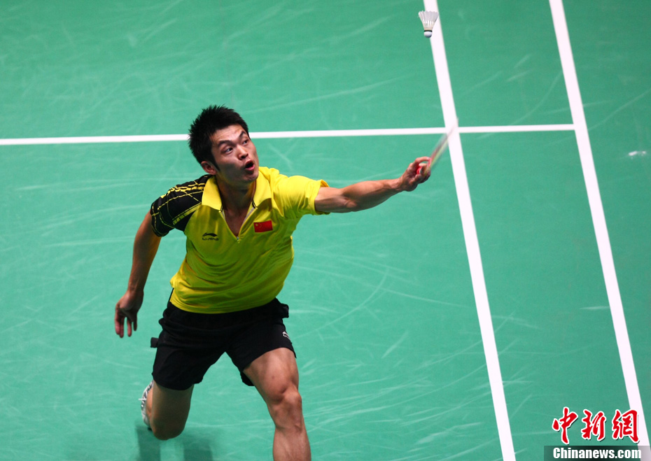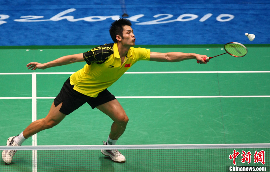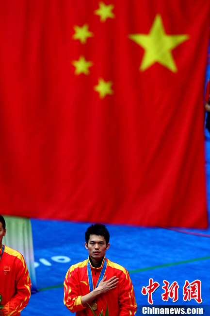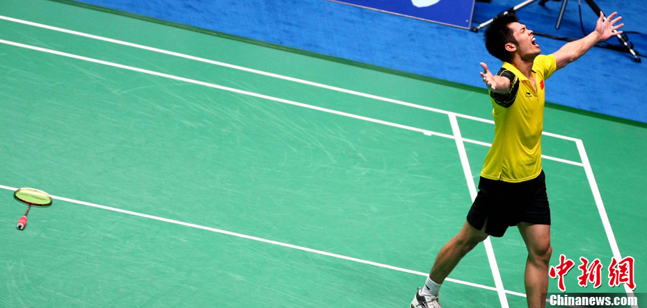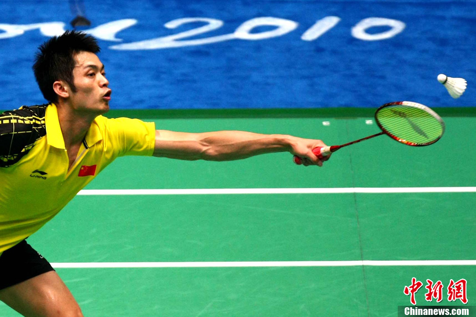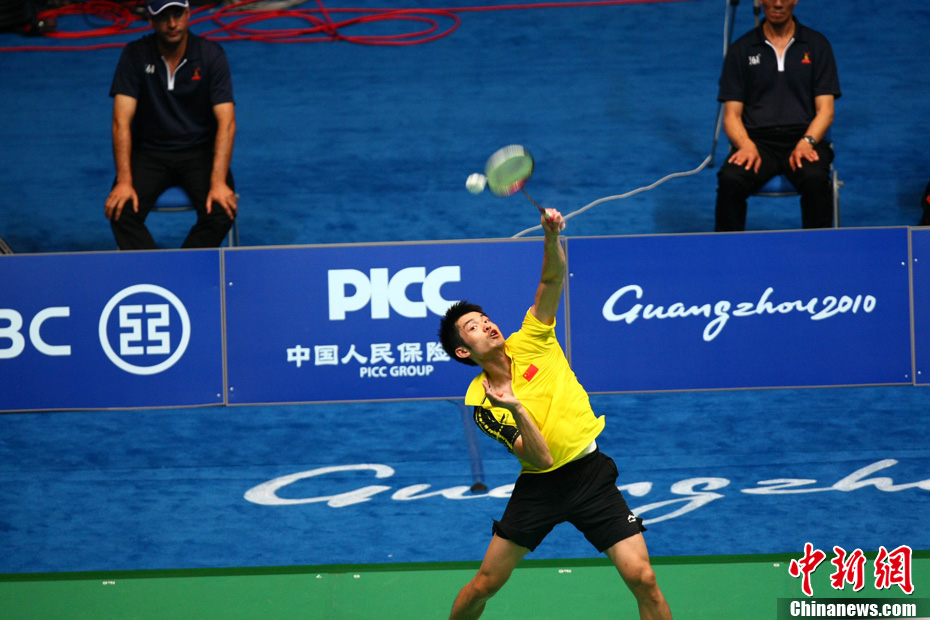 11月21日晚,2010年廣州亞運會天河體育館羽毛球賽場舉行男子單打決賽,中國隊的林丹對陣馬來西亞的李宗偉。最終,林丹2-1戰勝李宗偉奪冠。中新社記者 富田 攝