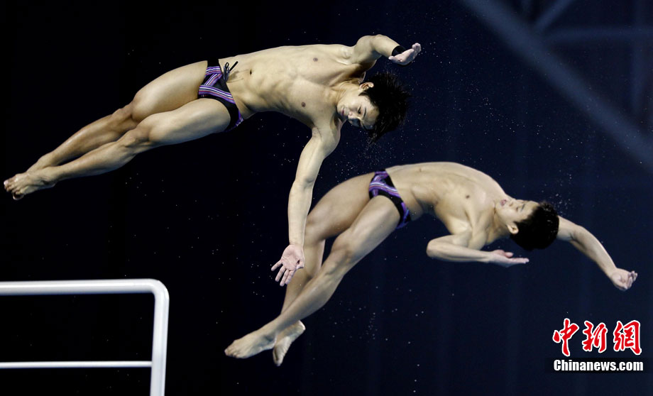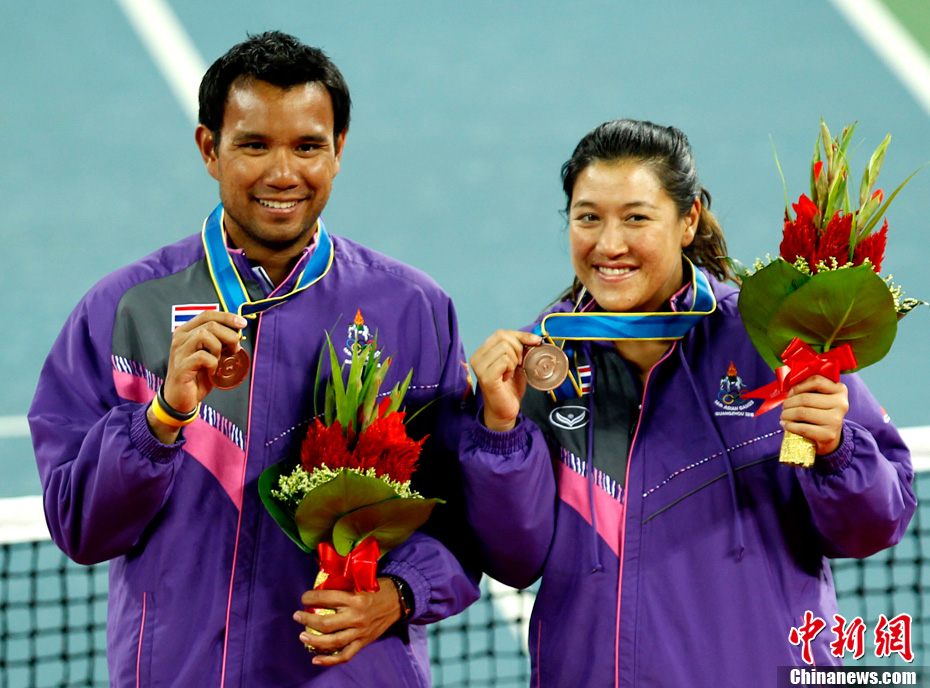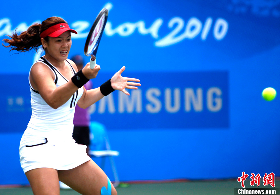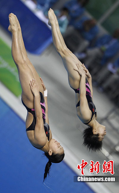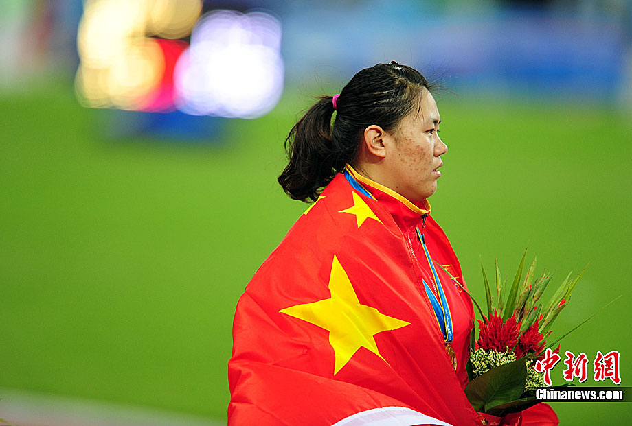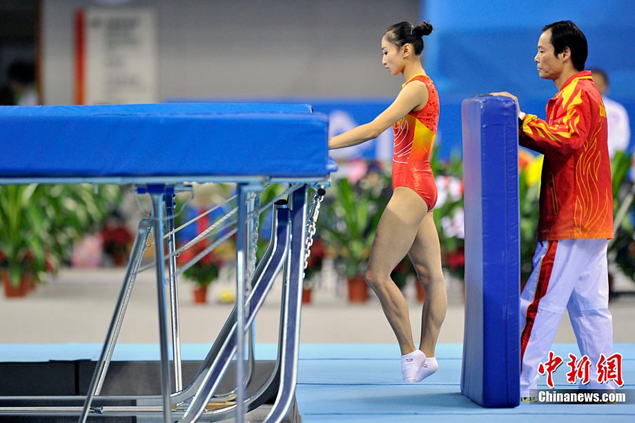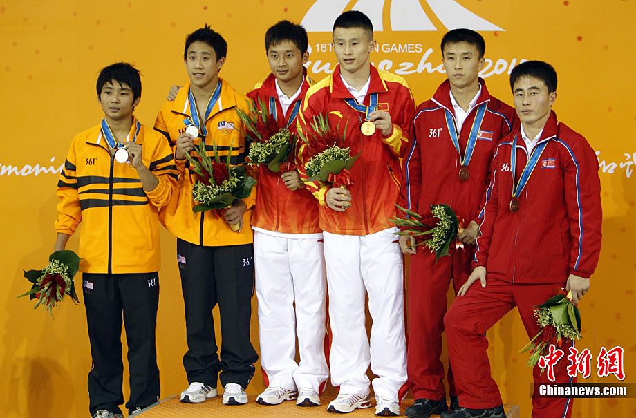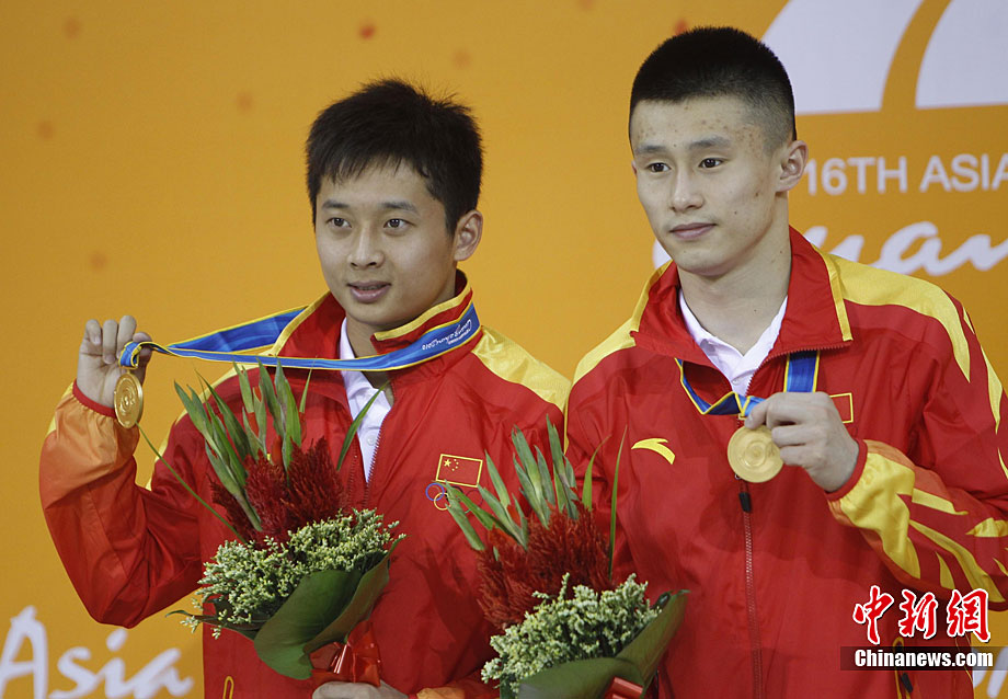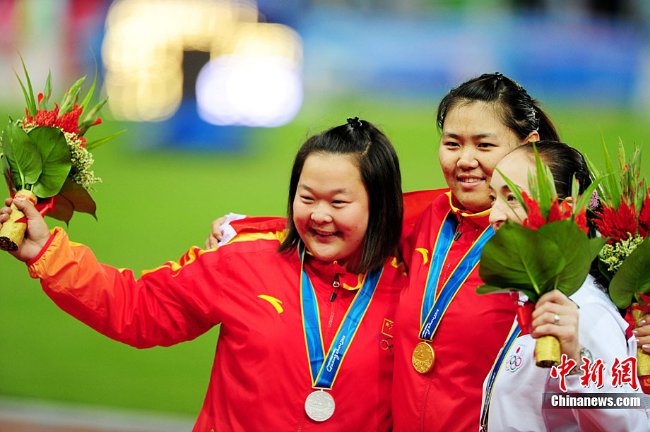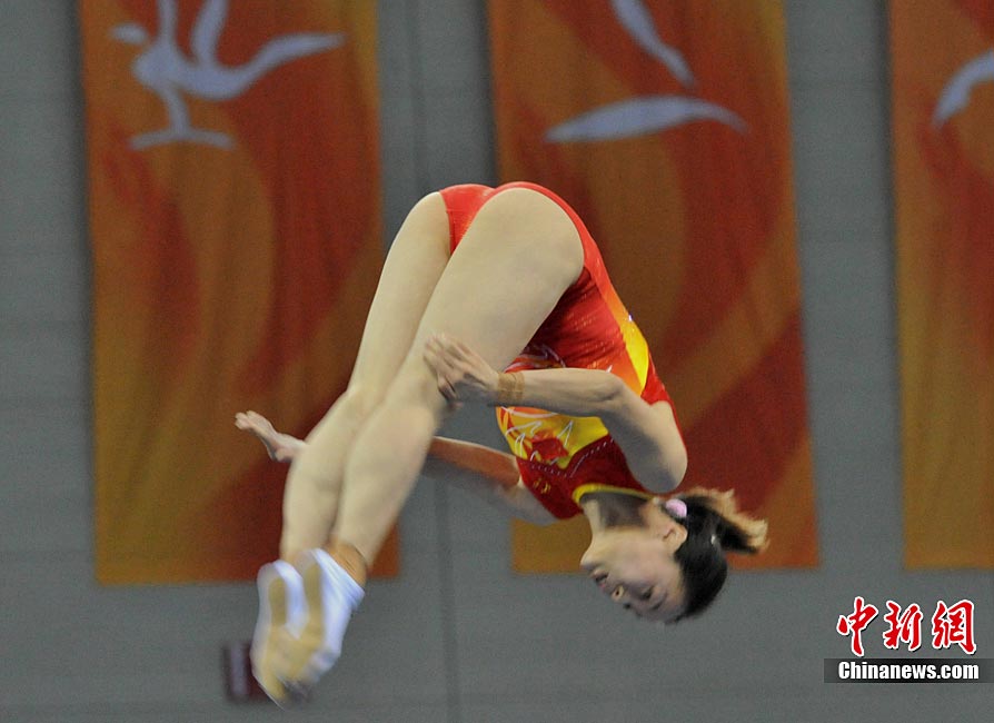 11月22日,廣州亞運會女子蹦床個人決賽以及男子個人蹦床決賽在亞運城體育館進行最后角逐。在女子個人比賽中,中國名將黃珊汕超水平發揮,以41.40分衛冕亞運會冠軍。奧運冠軍何雯娜由于難度差距,以40.90分收獲銀牌。中國選手董棟、涂瀟成功包攬這個項目的冠亞軍。黃珊汕、何雯娜走向領獎臺。中新社記者 任海霞 攝