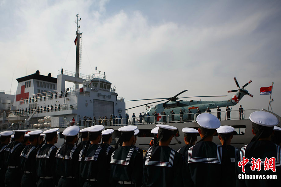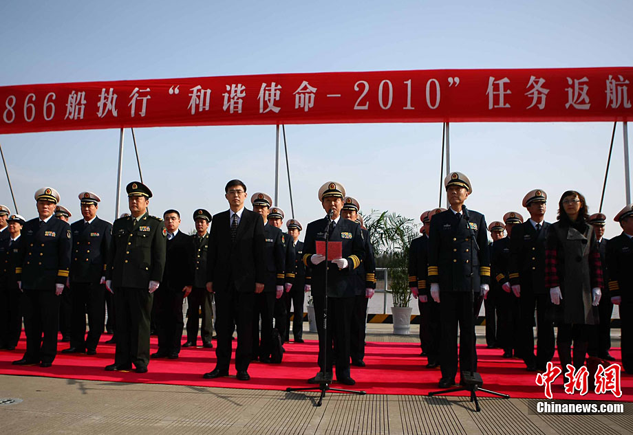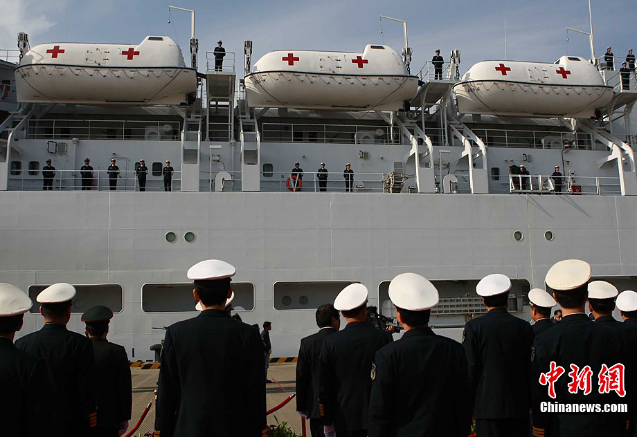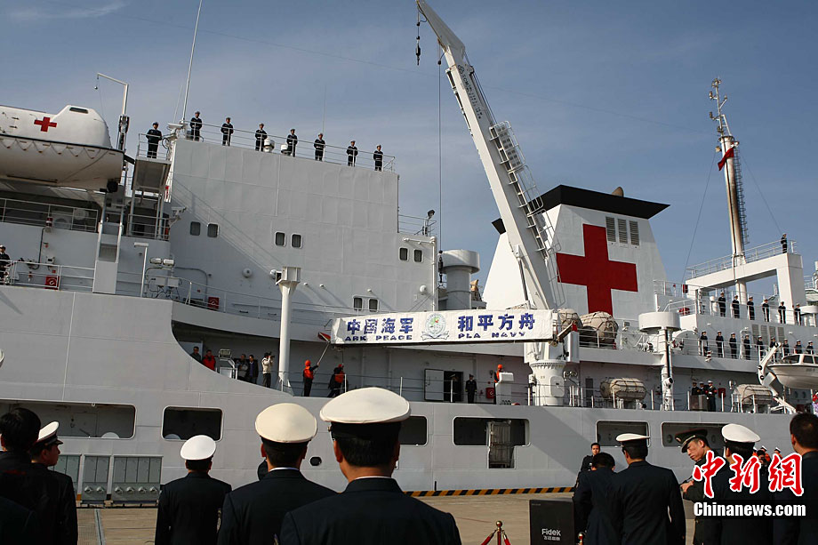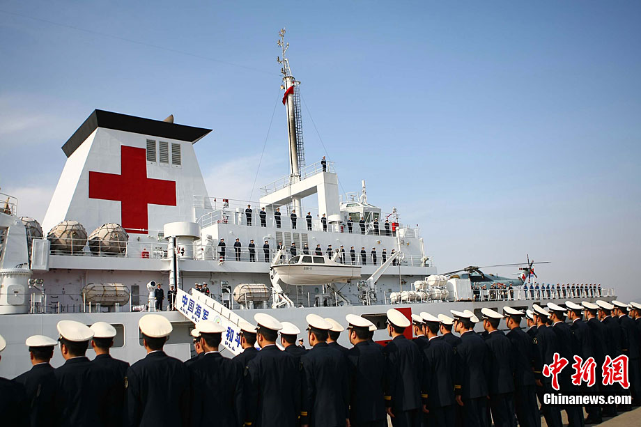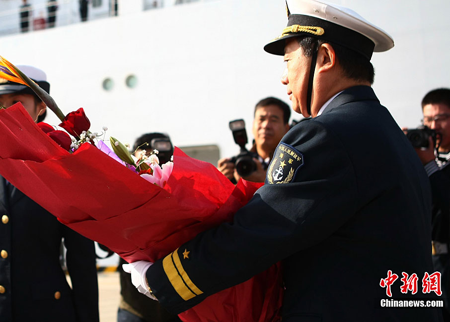 11月26日上午10時,中國海軍萬噸級醫院船“和平方舟”安全駛抵舟山軍港,這支歷時88天、航程17800海里的海上醫療隊、為海軍護航官兵和吉布提、肯尼亞、坦桑尼亞、塞舌爾和孟加拉等國民眾體檢2127人,門診診治12806人、醫療巡診1858人,輔助檢查15537人次,成功實施手術97例,贈送藥材36類790種。海軍副政委徐建中中將迎接執行任務的官兵歸來。宋吉河 攝