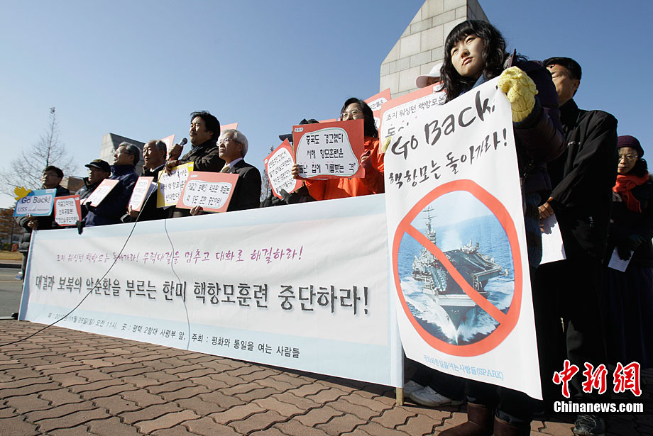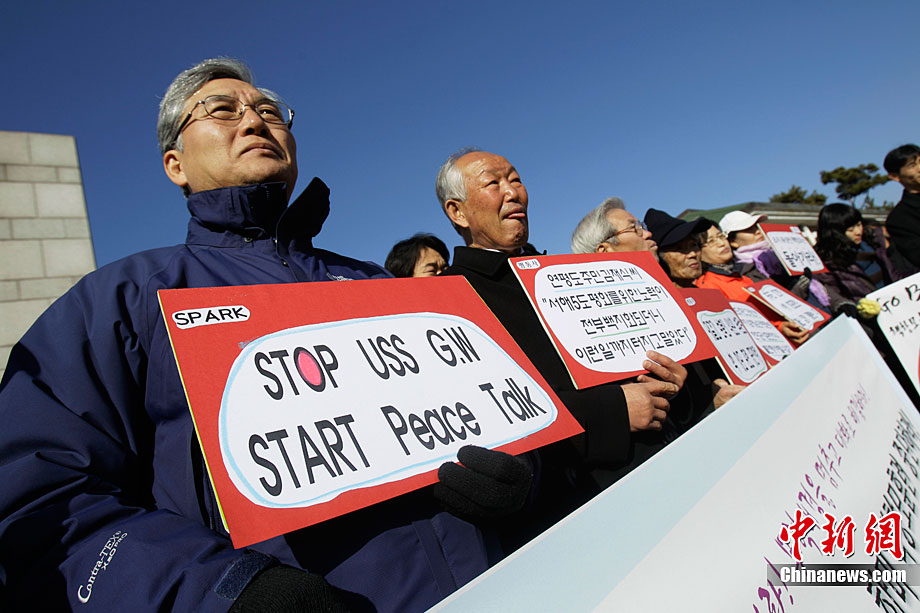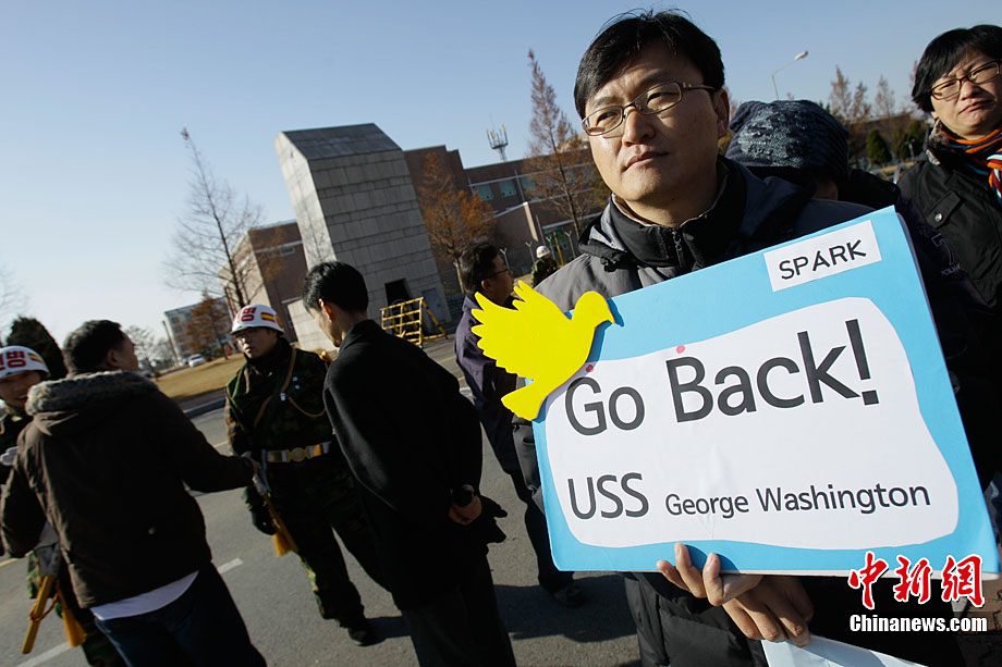 11月28日,韓國民眾在韓國軍事基地前舉行示威游行活動,譴責美國派遣航母參加美韓聯合軍演。這些民眾表示反對美國“喬治·華盛頓”號航母進入韓國領土,并與韓國軍方舉行軍事演習。