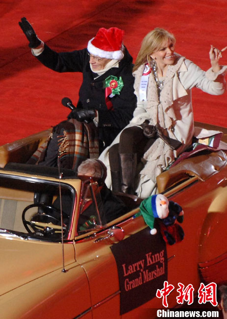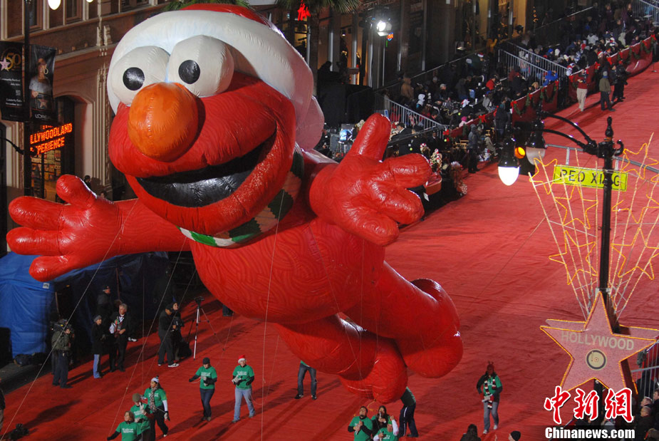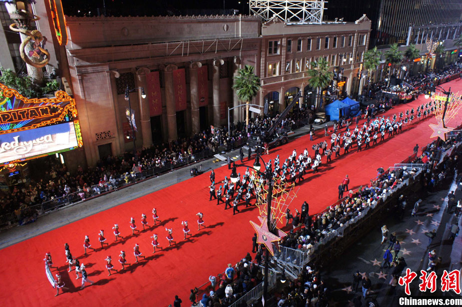 11月28日晚,一年一度的好萊塢迎圣誕大游行在好萊塢大道隆重舉行。CNN王牌主播拉里·金擔任今年游行的大禮官,在他的率領下,近60名好萊塢明星和14個樂隊、8個騎馬方陣、巨型充氣卡通、花車等游行隊伍依次通過紅地毯,為洛杉磯迎圣誕活動拉開大幕。好萊塢迎圣誕大游行始于1928年,至今已有80多年歷史。中新社發 張煒 攝