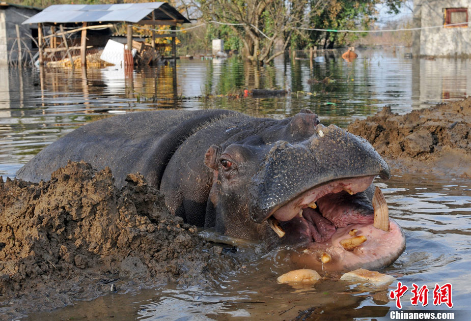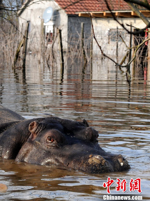 巴爾干半島西部連日來頻遭大雨侵襲,造成波斯尼亞和黑塞哥維那、塞爾維亞、黑山和阿爾巴尼亞的許多地區洪水泛濫,數千人被迫撤離家園。圖為6日,在黑山的普拉夫尼察,一頭從動物園中逃出的河馬在洪水中游泳。
