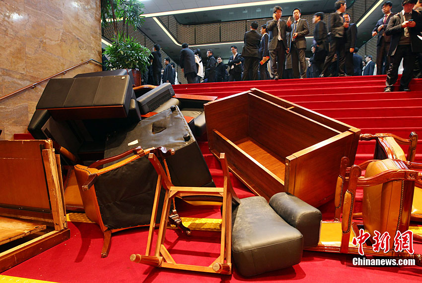 當地時間12月7日,韓國首爾國民議會大廳內,朝野議員再度爆發肢體沖突。據悉,本次議會會議的議題是2011年國家預算計劃案問題。