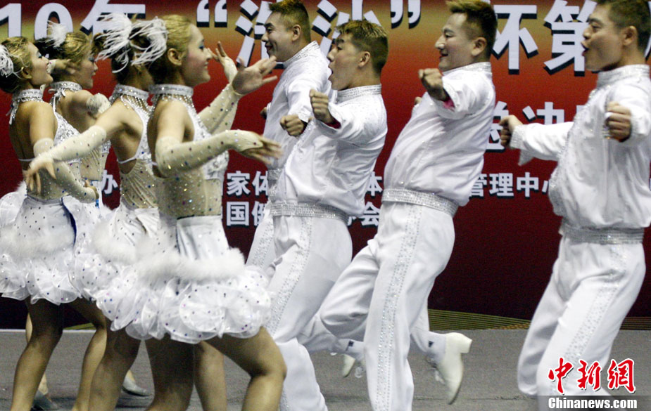 12月10日晚,正在山東棗莊市體育館舉行的2010年第9屆“浩沙杯”中國內地萬人健美操大賽總決賽上,來自中國內地20個賽區(qū)的優(yōu)秀團隊以風格不同、絢麗多姿的“排舞”形式比賽。全民健身排舞是集舞蹈、運動和文化于一體的舞蹈形式,因其健身性、娛樂性、觀賞性和群眾性的特點而深受人們喜愛。圖為參賽的各“排舞”隊在賽場上展示風采。