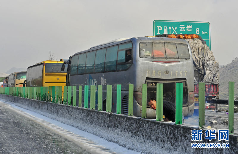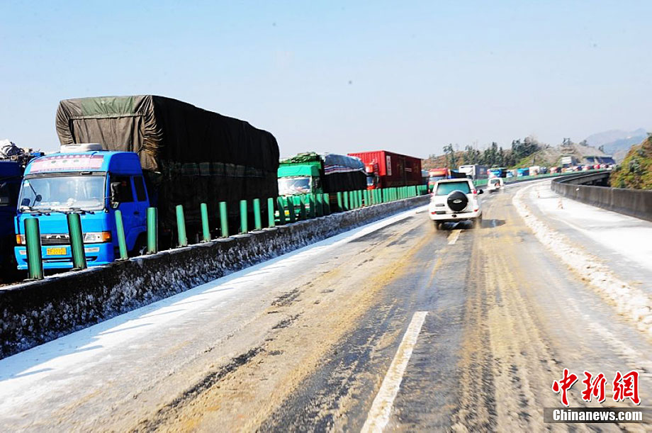 受強冷空氣南下影響,廣東北部山區氣溫降至零下,境內的京港澳高速乳源段和坪乳公路路面結冰,交通從12月16日凌晨開始中斷,大量車輛滯留。經全力抗冰搶險,相關路段于16日14時許恢復正常通行。17日,已搶通的京港澳高速公路粵北段路面再次結冰,車輛滯留10公里。李凌 攝