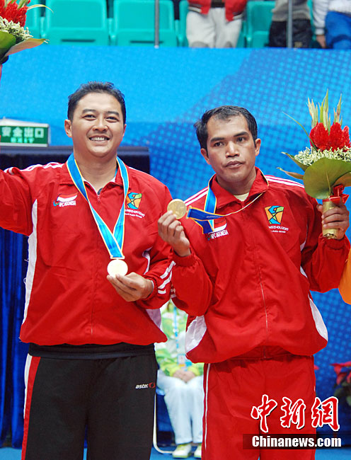 12月18日,廣州2010亞殘運會,羽毛球男子雙打站立一二三級決賽在天河體育館舉行,印度尼西亞運動員哈里·蘇桑托和特里霍諾為印度尼西亞奪得第一枚金牌。尹雪峰 攝