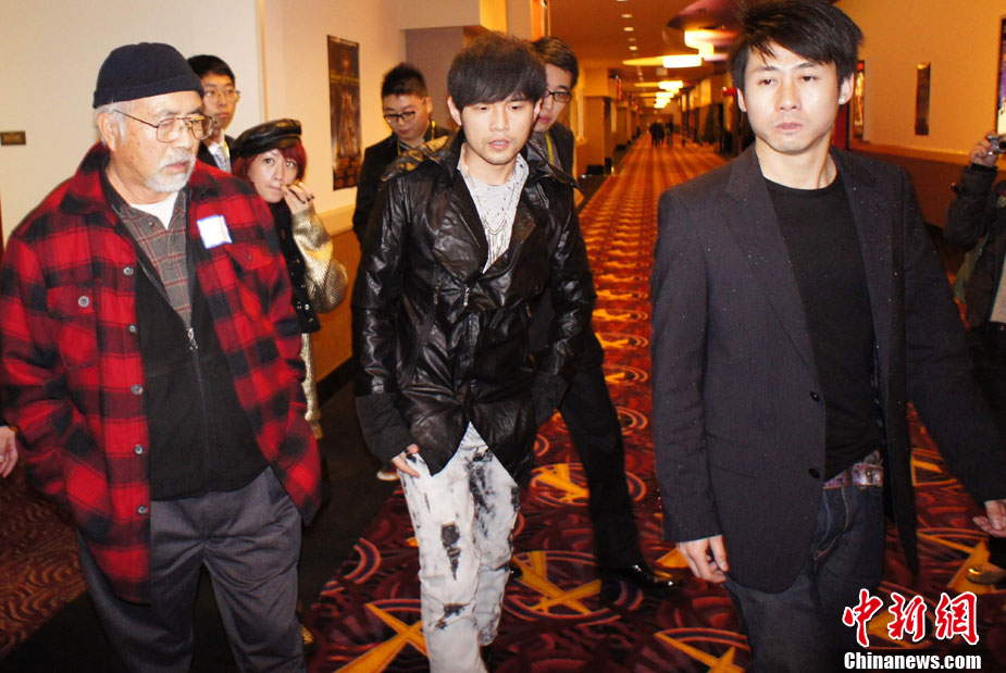 臺灣著名歌星周杰倫12月20日飛抵洛杉磯,他在記者會上首次正式澄清,日前在臺北一起用餐的年輕女性不是女友。中新社發 張煒 攝