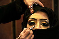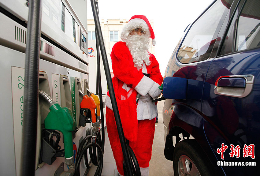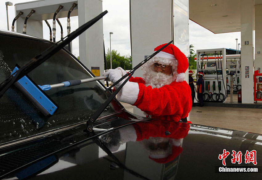 12月23日,印度尼西亞坦格朗市的一座加油站內,工作人員身著圣誕老人的服裝,為過往車輛加油、洗車。