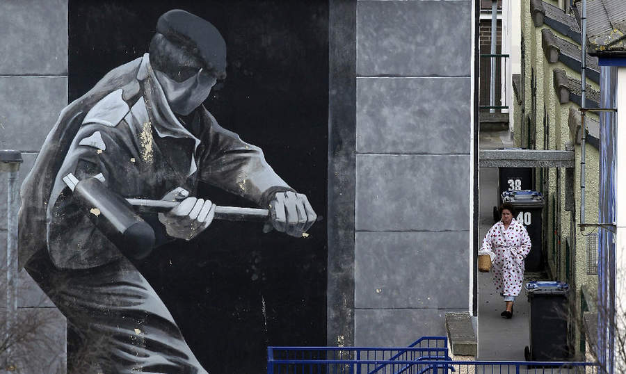 2010年3月23日,在愛爾蘭北部的德里布,一名女子正在向外倒垃圾。旁邊的壁畫上,一名英國士兵正使用大錘子擊倒一棟房子的大門。