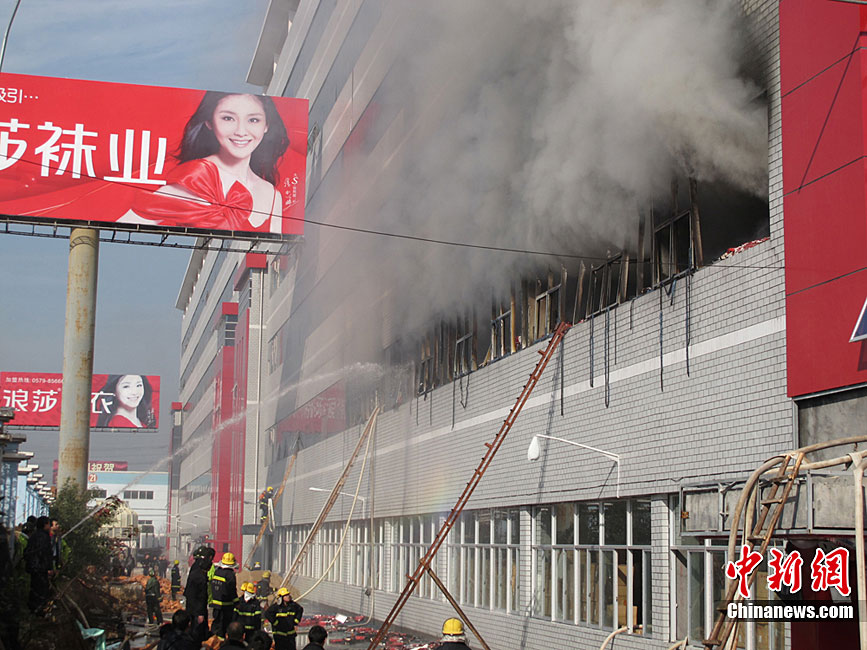12月28日上午10時(shí)50分許,浙江省義烏市知名企業(yè)浪莎集團(tuán)倉(cāng)庫(kù)樓發(fā)生火災(zāi)。因火勢(shì)較大,金華消防總共出動(dòng)了三十幾輛消防車參與救火,倉(cāng)庫(kù)內(nèi)9名工作人員均已安全疏散,確定無人員傷亡情況。張茵 攝