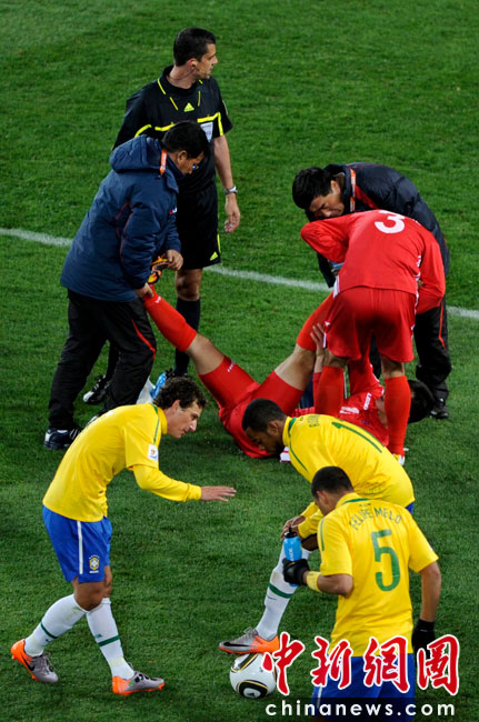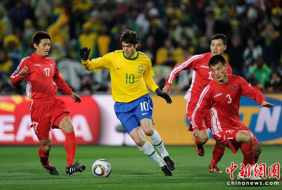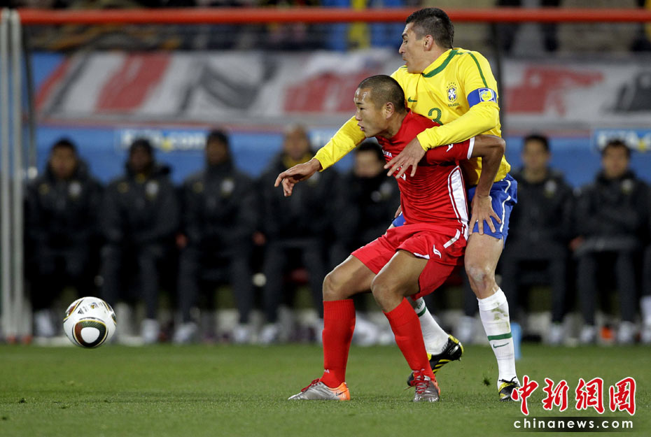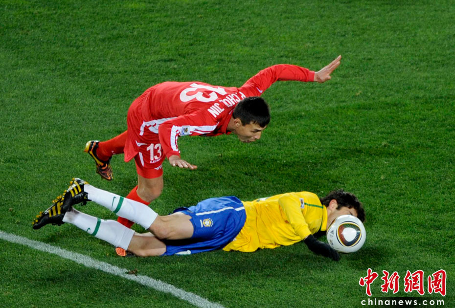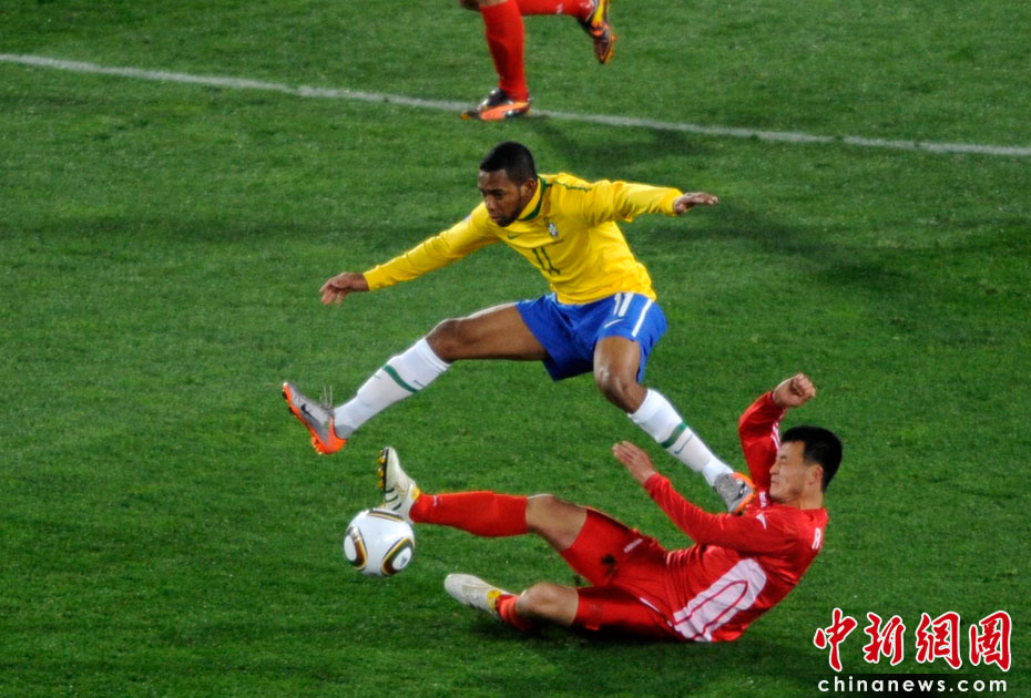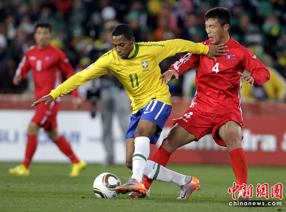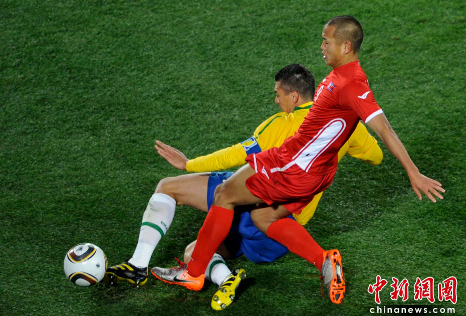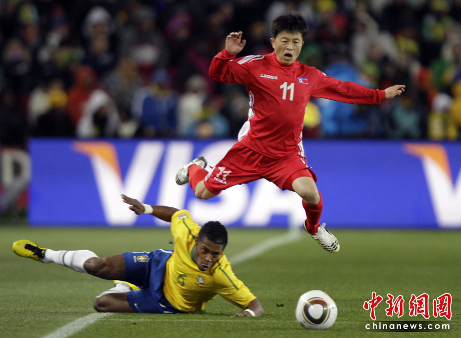 北京時間6月16日凌晨2:30進行的一場世界杯小組賽G組的較量中,巴西隊迎來了朝鮮隊。最終經過90分鐘激戰,巴西隊2-1擊敗朝鮮,贏得南非世界杯開門紅。中新社記者 廖攀 攝