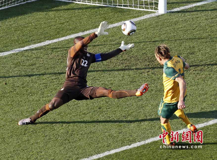 6月19日,世界杯D組第2輪一場小組賽在勒斯騰堡的皇家班佛肯球場展開,加納隊迎戰澳大利亞隊。最終被罰下一人的澳大利亞隊1比1逼平加納。