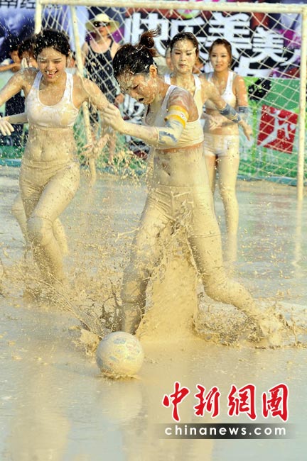 南非世界杯戰(zhàn)火越燃越烈,各地的世界杯熱潮也席卷而來。近日,一檔比基尼美女足球賽在長沙開鑼,和世界杯男足不同的是,美女們是在泥漿中比賽。據(jù)悉,這檔名為《快樂美美向前沖》的足球賽已在湖南經(jīng)視播出。節(jié)目中,為了順利闖關(guān),眾美女不顧形象,在泥漿中匍匐前進(jìn)和翻滾,引得觀眾爆笑如雷。圖為首場比賽中,湖南隊(duì)美女與湖北隊(duì)美女在連闖四關(guān)后,進(jìn)入泥漿場內(nèi)進(jìn)行終極球賽PK。湖南經(jīng)視供圖