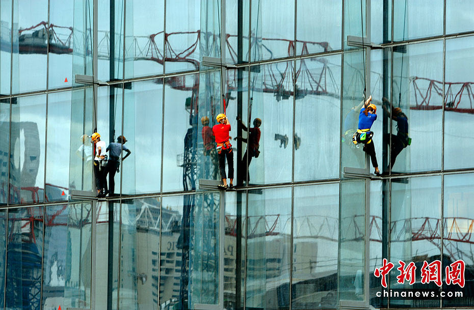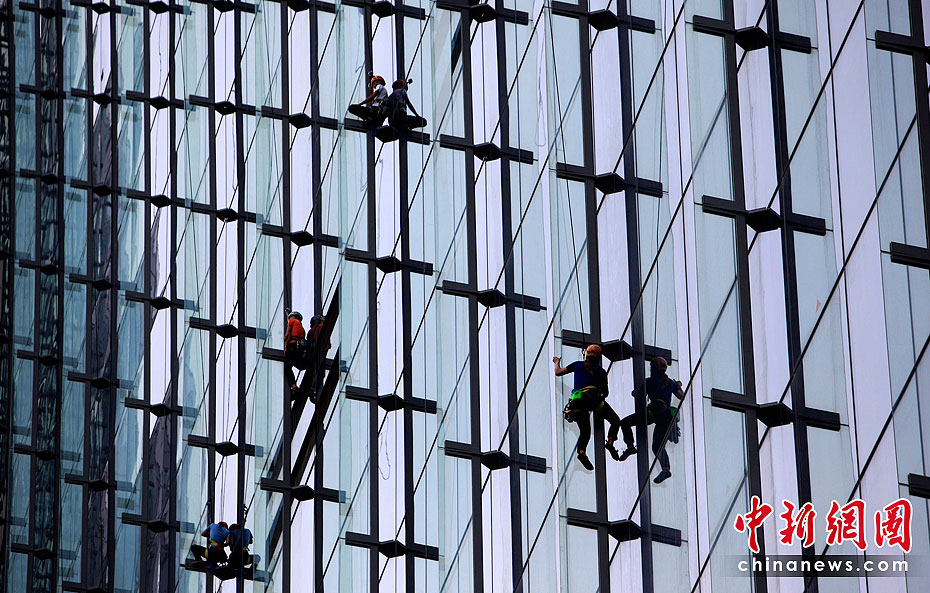 當地時間6月23日,21名專業登山者參加了在新加坡舉行的首屆世界攀登高塔錦標賽。21位專業登山者同時攀爬3座55層樓高的濱海灣金沙酒店,最先爬到樓頂者為勝。