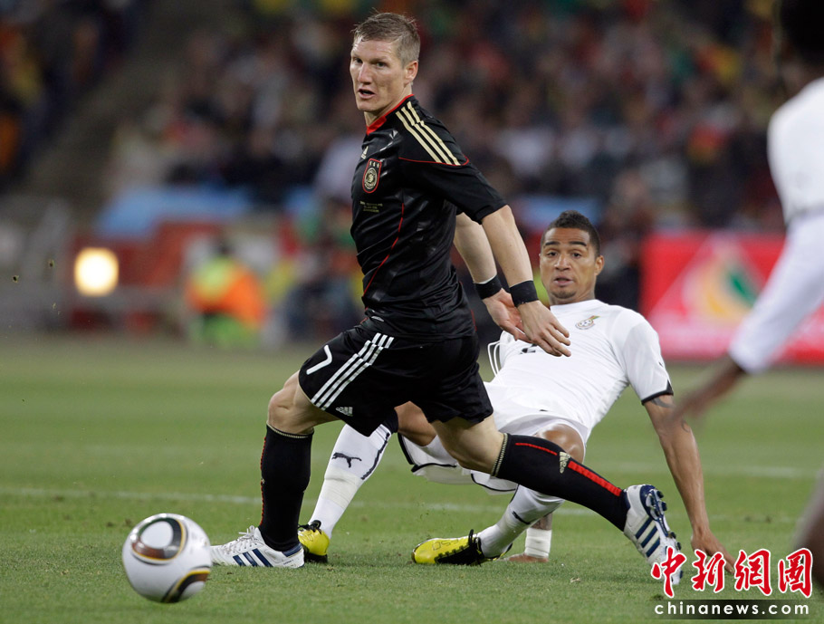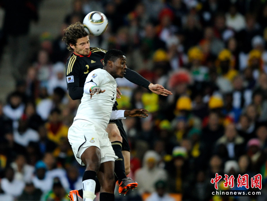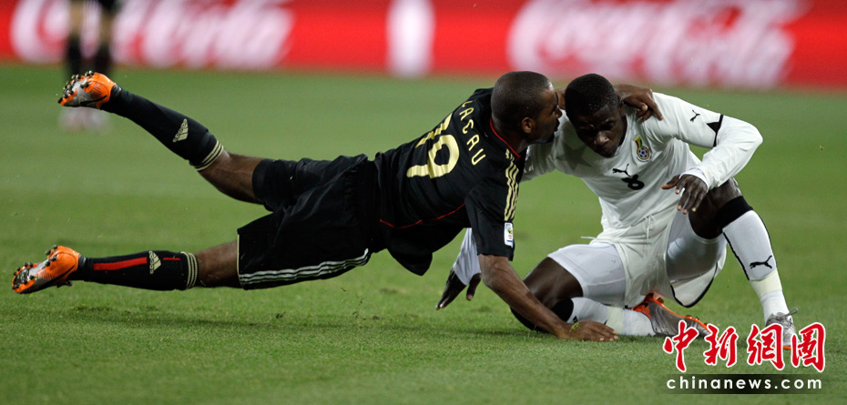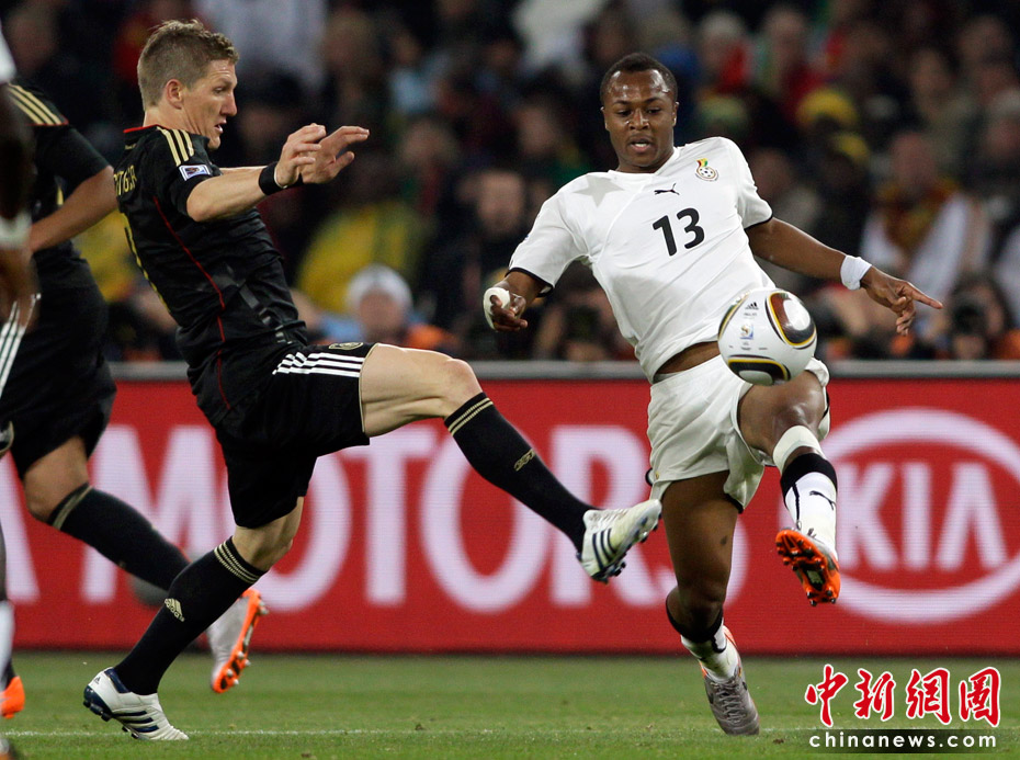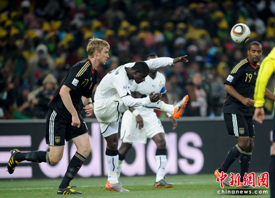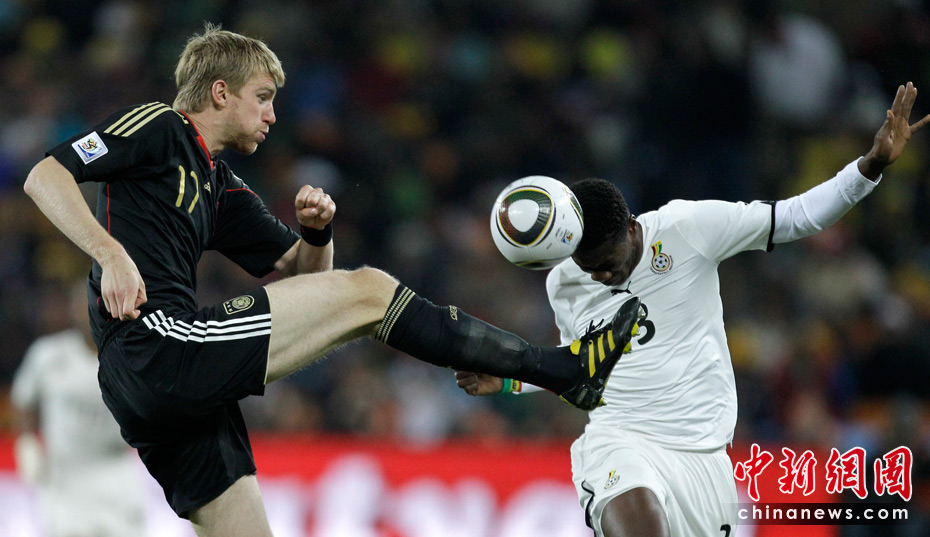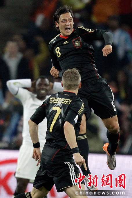 北京時間24日凌晨,世界杯小組賽D組迎來“決戰之夜”。歐洲勁旅德國隊在約翰內斯堡足球城體育場迎戰加納隊。最終,憑借著中場球員厄齊爾的制勝一球,德國隊1比0擊敗加納隊,兩隊攜手進軍16強。德國隊三戰2勝1負排名小組第一,他們在1/8決賽的對手將是老冤家英格蘭隊。加納隊小組第二出線,將與美國隊爭奪一個八強席位。中新社記者 廖攀 攝