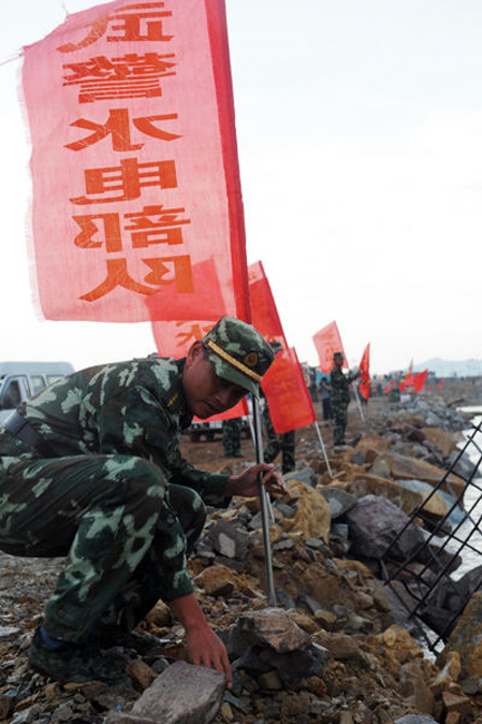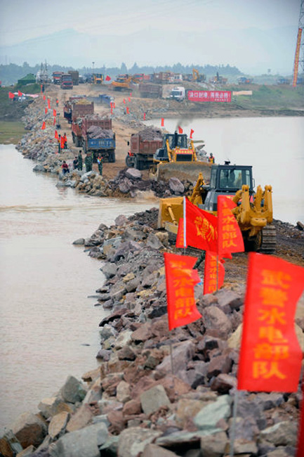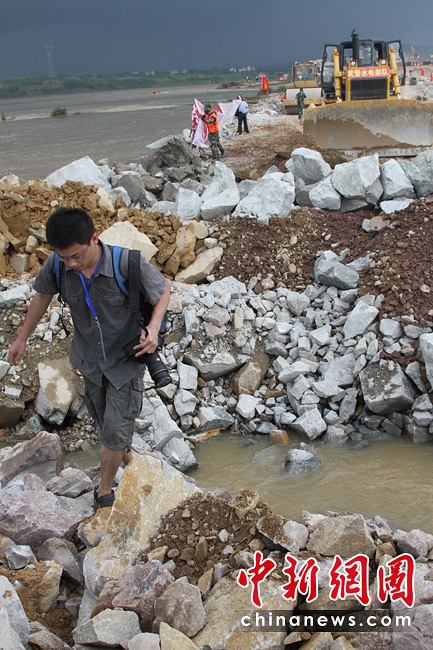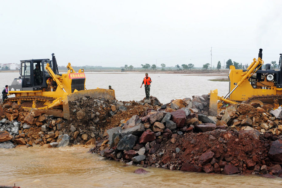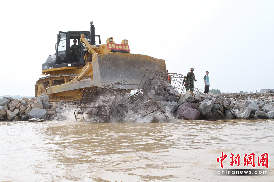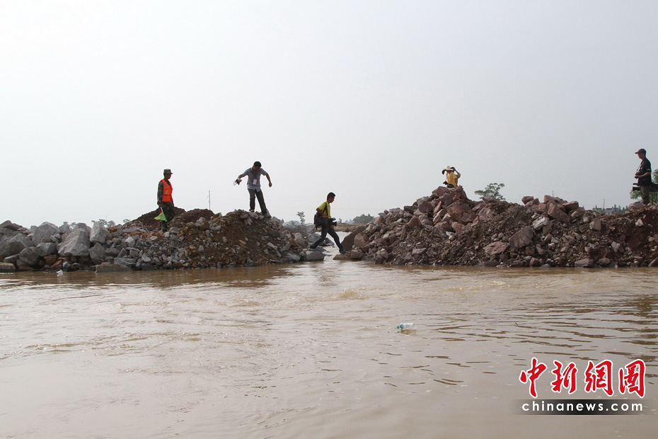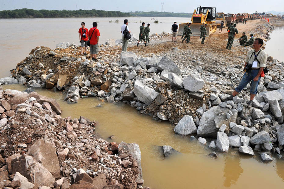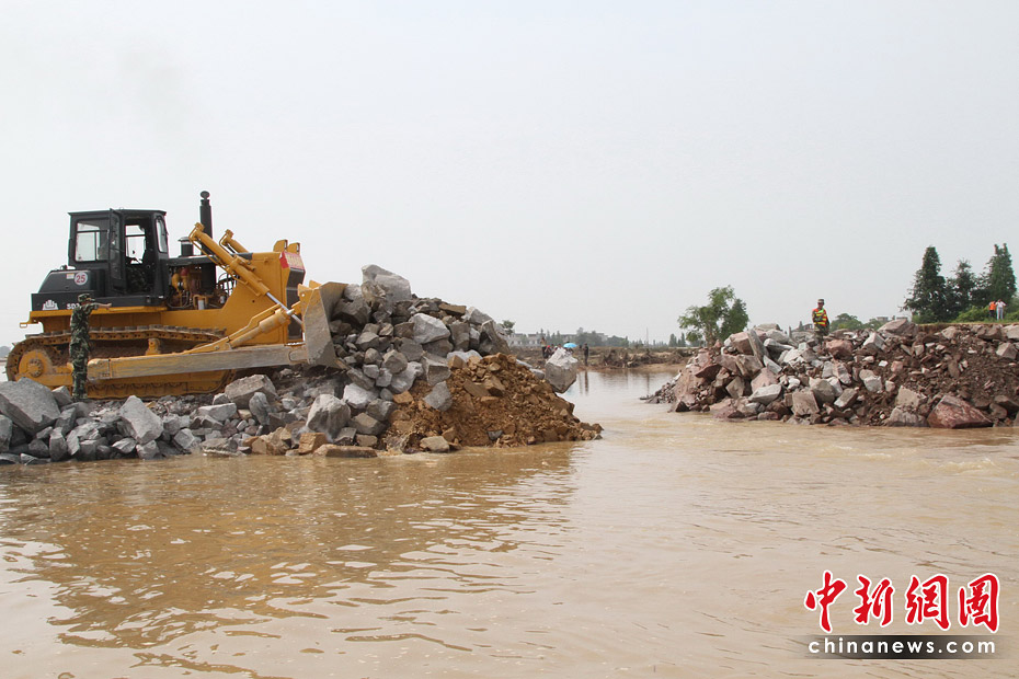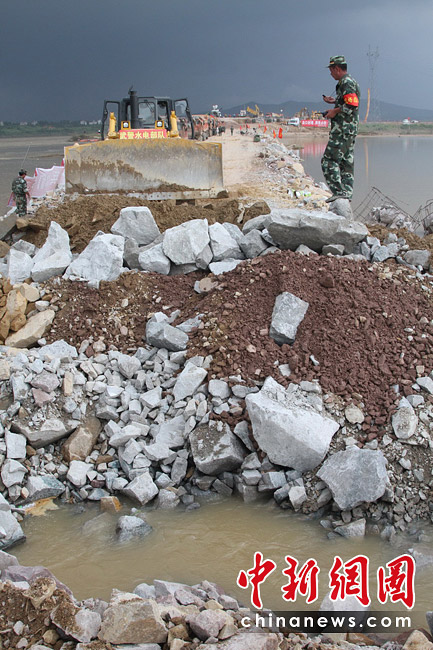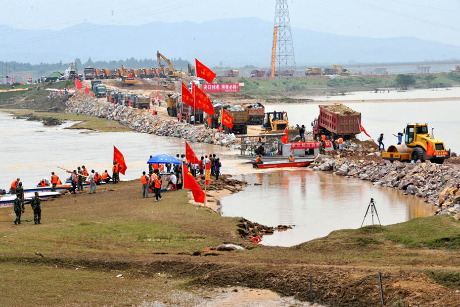 隨著最后一車土石投入河道,決口6天的江西撫州唱凱大堤終于合龍,恢復了它完整的堤身。原計劃6天完成的決口封堵任務提前3天完成。圖片來源:新華網 章武 攝