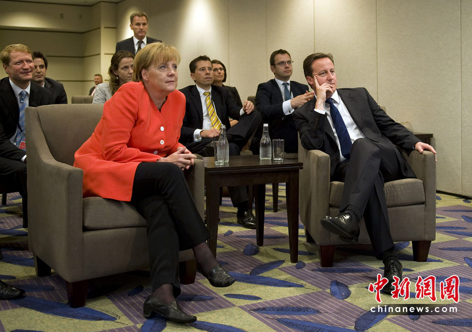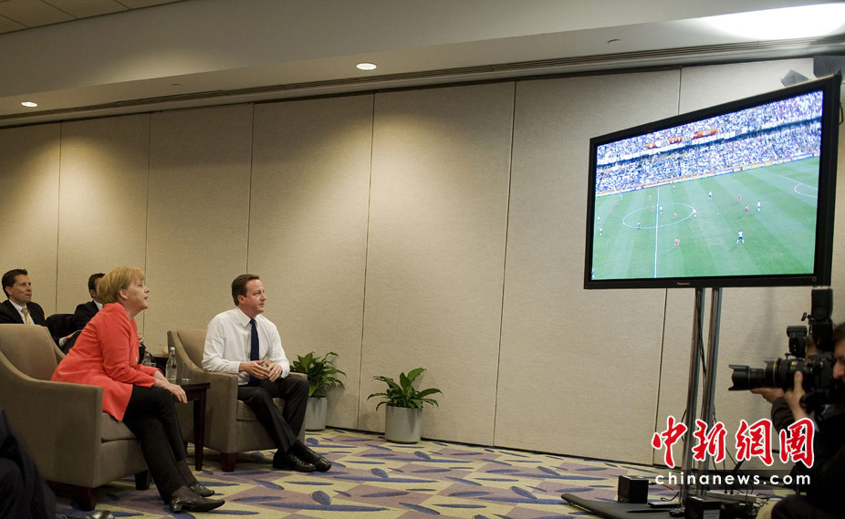 6月27日,正在加拿大參加G20領導人峰會的德國總理默克爾和英國首相卡梅倫,一同觀看了世界杯英格蘭與德國隊的比賽。