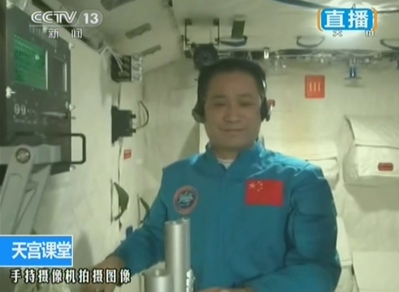 6月20日上午10時許,神舟十號航天員進行中國首次太空授課,女航天員王亞平擔任主講,成為中國首位“太空教師”。圖為指令長聶海勝擔任助教。(視頻截圖)