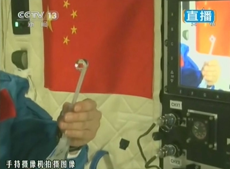 6月20日上午10時許,神舟十號航天員進行中國首次太空授課,女航天員王亞平擔任主講,成為中國首位“太空教師”。(視頻截圖)