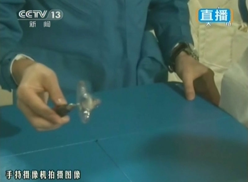 6月20日上午10時許,神舟十號航天員進行中國首次太空授課,女航天員王亞平擔任主講,成為中國首位“太空教師”。圖為王亞平進行“水膜”演示。(視頻截圖)