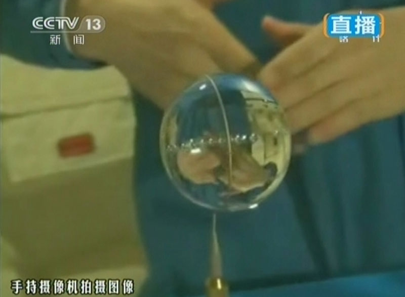 6月20日上午10時許,神舟十號航天員進行中國首次太空授課,女航天員王亞平擔任主講,成為中國首位“太空教師”。圖為王亞平“玩水球”。(視頻截圖)