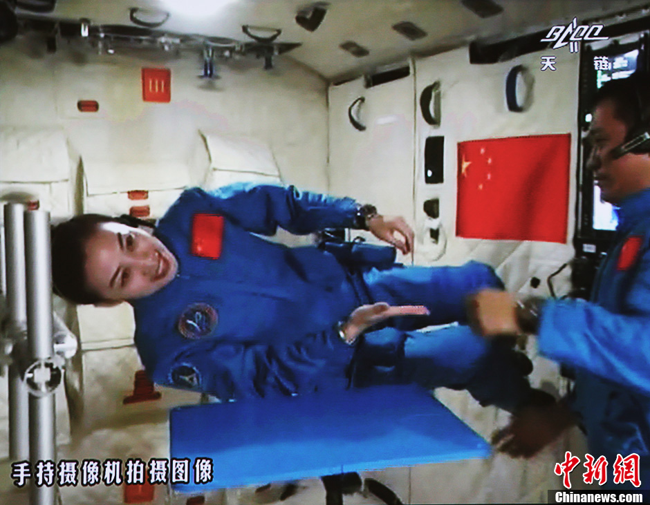 6月20日10時許,神舟十號航天員在天宮一號開展基礎物理實驗,為青少年進行中國首次太空授課。圖為王亞平講授太空失重提供條件下的方位感演示。中新社發 秦憲安 攝
