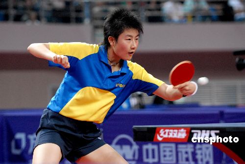 2007年10月26日,第六屆全國城市運動會乒乓球女子單打決賽在武漢洪山體育館舉行。繼半決賽擊敗世乒賽女單冠軍郭躍后,成都市代表隊小將丁寧奮力拼博,又以4:2力克另一名世界名將、濟南市代表隊的李曉霞,獲乒乓球女子單打冠軍,摘取了“六城會”女子乒乓球單打決賽金牌。中新社發 楚天行 攝