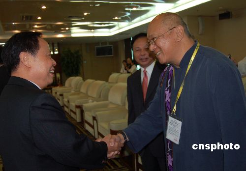 十月二十九日,二〇〇七海外華商相聚中國(guó)—東盟博覽會(huì)暨廣西商機(jī)介紹會(huì)在廣西南寧舉行,兩百名華商參加會(huì)議,會(huì)上簽約十八個(gè)項(xiàng)目,金額三點(diǎn)八六億美元。會(huì)前廣西壯族自治區(qū)主席陸兵(左)會(huì)見(jiàn)出席會(huì)議的著名僑領(lǐng)陳嘉庚先生的長(zhǎng)孫、新加坡華德私人有限公司董事長(zhǎng)陳立人。中新社發(fā) 劉萬(wàn)強(qiáng) 攝