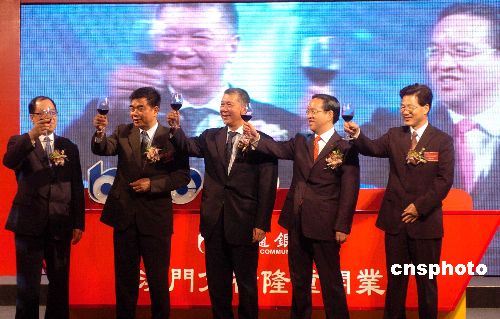 十一月一日晚,中國交通銀行澳門分行開業儀式在旅游塔舉行,澳門特首何厚鏵(中)舉杯祝賀開業。中新社發 史利 攝