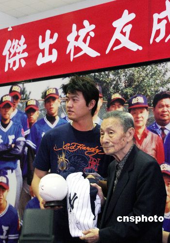 11月23日,臺灣著名棒球明星王建民回到高中母校臺北縣土城私立中華中學,受到學弟、妹們的英雄式歡迎,并成為該中學創(chuàng)校45年以來,獲頒杰出校友獎的第一人。圖為王建民與87歲的中學創(chuàng)辦人卞堃互換紀念品。據(jù)悉,中華中學一向是臺灣棒球運動員搖籃,自1981年與榮民工程公司前身榮民工程事業(yè)管理處建教合作成立青棒隊起,至今已培育出職棒好手110人,王建民于1996年至1998年就讀該校。中新社發(fā) 黃少華 攝