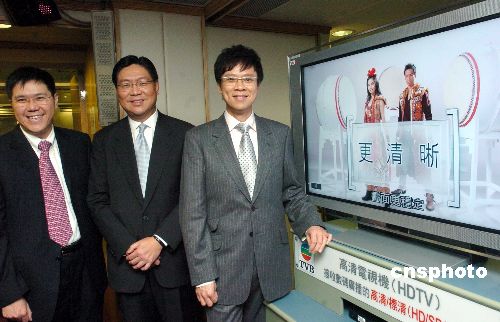 11月26日,香港就推出“數(shù)碼地面電視廣播”舉行記者會(huì),商務(wù)及經(jīng)濟(jì)發(fā)展局局長馬時(shí)亨,與電視廣播有限公司的高層陳志云(右)和鄭善強(qiáng)(左)在記者會(huì)現(xiàn)場,參觀香港電視廣播有限公司(TVB)的高清數(shù)碼電視廣播的片段。中新社發(fā) 鄧慶樂 攝