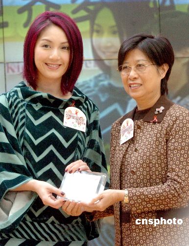 11月30日,“世界愛滋病日2007活動開展禮”在香港舉行開啟儀式,行政長官夫人曾鮑笑薇代表大會向藝人楊千嬅致送紀念品,以感謝她為活動拍攝宣傳短片,推廣正視對抗愛滋病的訊息。中新社發 鄧慶樂 攝