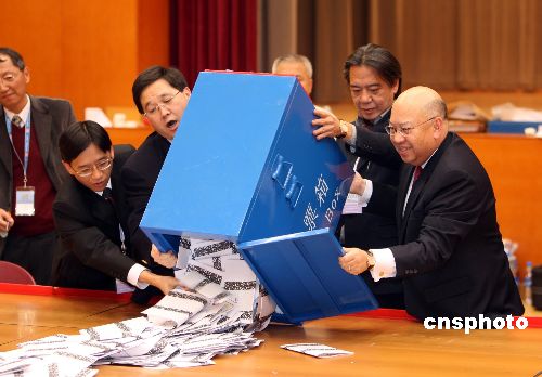 12月2日深夜,香港選管會主席彭鍵基[右]及政制及內地事務局局長林瑞麟[左二]到達票站,開啟票箱,票站內點票工作隨即展開。當日,香港立法會港島區補選共有八名候選人競逐一個議席,分別是:柳玉成、李永健、蕭思江、葉劉淑儀、蔣志偉、凌尉云、陳方安生、以及何來。中新社發 洪少葵 攝