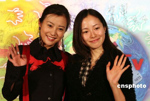 十二月四日,大陸知名演員郝蕾(左)、江一燕在臺北參加“二00七臺灣國際影視創投會”開幕式,成為媒體競相拍照的焦點。中新社發 董會峰 攝